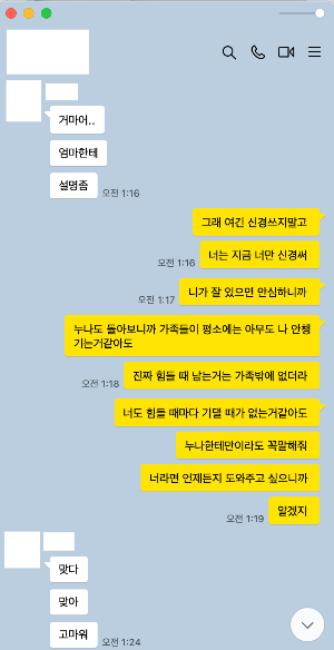 퇴근 후 상담대학원 준비를 위해 현대심리학을 공부하다가 너무 지쳐 잠깐 쉰다는 게 잠에 들었다. 한 시간 정도 지났을까 동생에게 보이스톡이 왔다. 보통 동생과는 카톡으로 대화하는데 보이스톡이 와서 반가운 마음에 전화를 받았다.