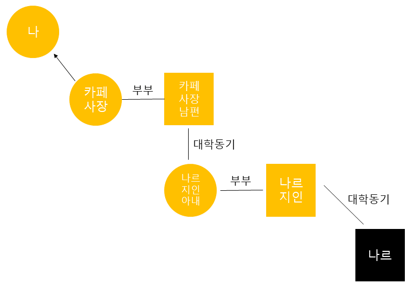 나는 카페 사장님을 아는 사이였고, 카페 사장님 남편과 나르 지인의 아내는 대학동기이다. 나르 지인은 나르와 야간 대학동기로 나이 차이는 많이 났지만 형님-동생 하는 관계였고, 나르 지인의 아내는 자신의 남편과 나르와 자주 만났다고 한다. 나르 지인의 아내는 내가 학교에서 강사로 잠깐 알바를 했던 적이 있는데 그때 수강생이었다. 나르가 일하고 있는 장애인 복지관이 나르 지인의 집과 가까웠고 나르 지인의 부부는 나르를 사위로 삼고 싶어 할 만큼 나르를 좋아했다. 나르 지인 부부는 딸이 있었는데 나이 차이가 너무 많이 났다. 그래서 짝으로 맺어줄 좋은 자매를 찾고 있다고 카페 사장님 부부에게 말을 했고, 카페 사장님 남편과 카페 사장님은 나르 지인 부부를 통해 나르에 대한 얘기를 들어왔는데 카페 사장님이 그 얘기를 듣자마자 내가 생각났다고 했다.