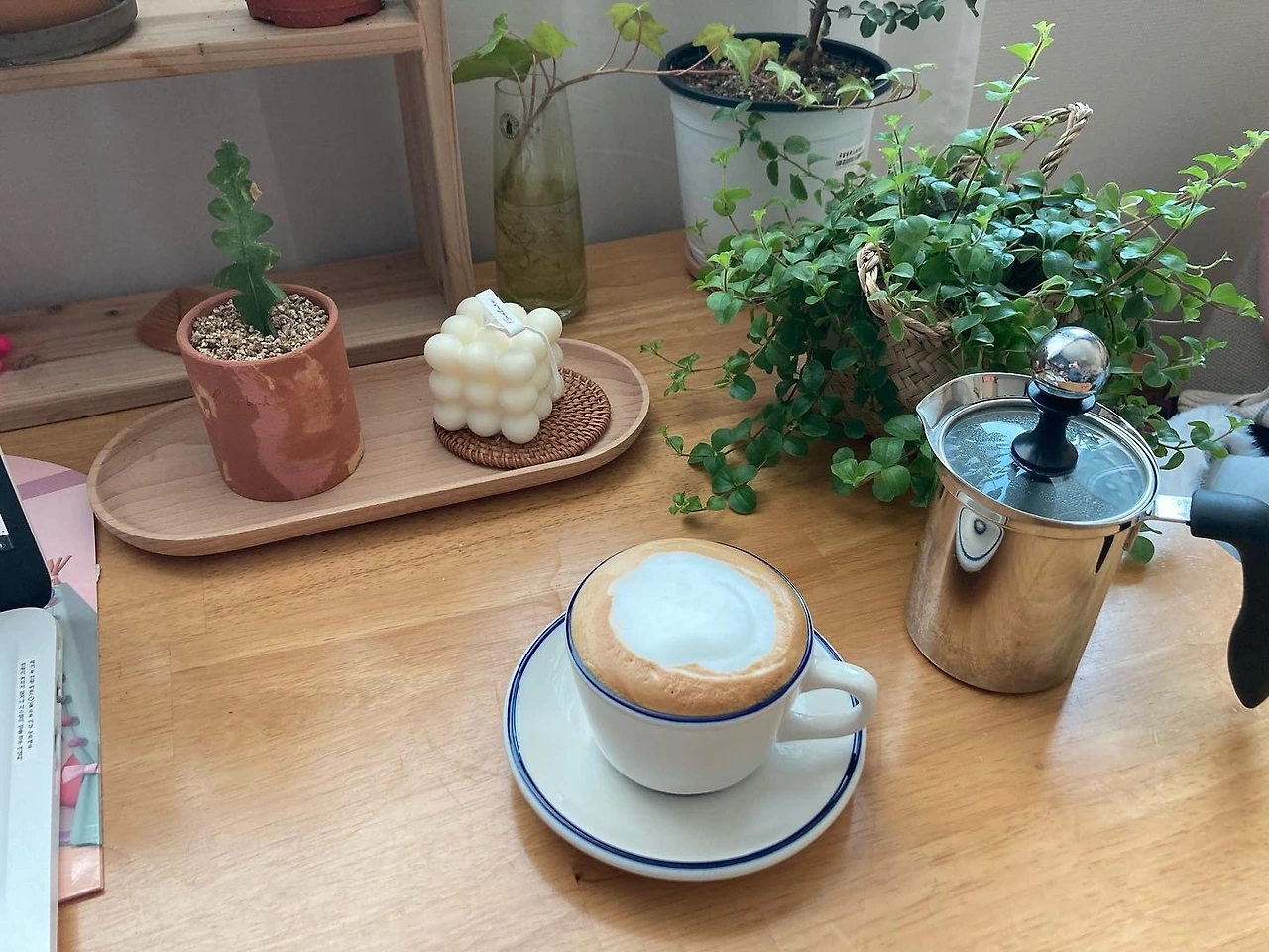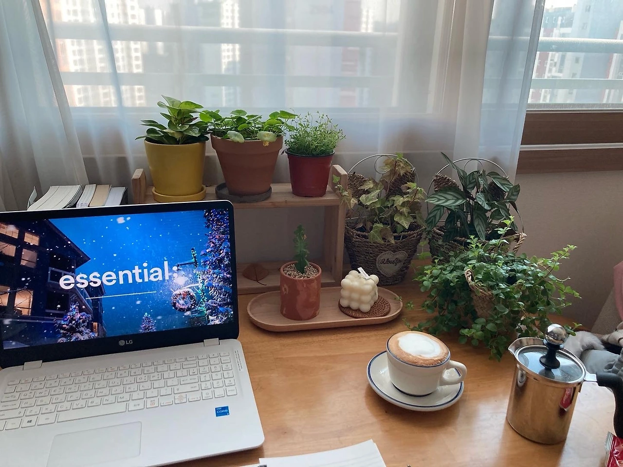 코로나가 장기화되면서 가장 먼저 한 일은 끝 방에 내 책상을 마련하는 것이었다. 식탁으로 쓰던 테이블을 창가 앞에 놓고 책장을 샀다. 여기저기 널려있던 책들을 정리해서 나만의 서재이자 홈 카페를 만들었다. 더 이상 나가서 쓸 수 없는 상황이 왔기 때문에 집안에 나만의 유혹적인 공간을 만들어야 했다. 하얀색 커튼을 치고 좋아하는 페페와 고무나무 화분을 올려두었다. 감명 깊게 읽은 책들을 꽂아두고 하얀색 스탠드도 마련했다. 아무리 집안이 어질러지고 난리가 나도 그 책상 자리만은 늘 깨끗하게 치우고 정갈한 모습으로 유지하려 애썼다.