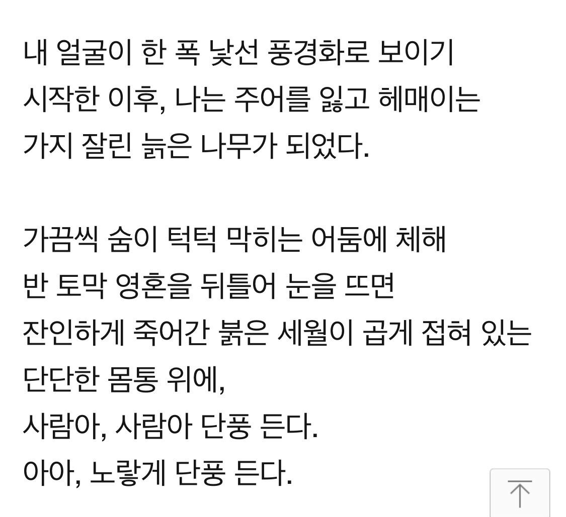 청춘 땐 내가 내 삶의 주인공 같았지만 중년으로 넘어가며 그런 감각은 희미해지고 누군가의 혹은 무언가의 변방으로 밀려나 풍경이 되어가는 느낌을 지우기 힘들다. 그 느낌은 최초로 겪는 느낌이라 아주 낯선 것이어서 ‘내 얼굴이 한 폭 낯선 풍경화처럼 보이기 시작한 이후 나는 주어를 잃고 헤매이는 가지 잘린 늙은 나무가 되었다’고 시인은 말한다. 그렇게 잔인한 붉은 세월에 지나온 초록에 더해지면서 사람은, 노랗게 단풍이 들어간다,