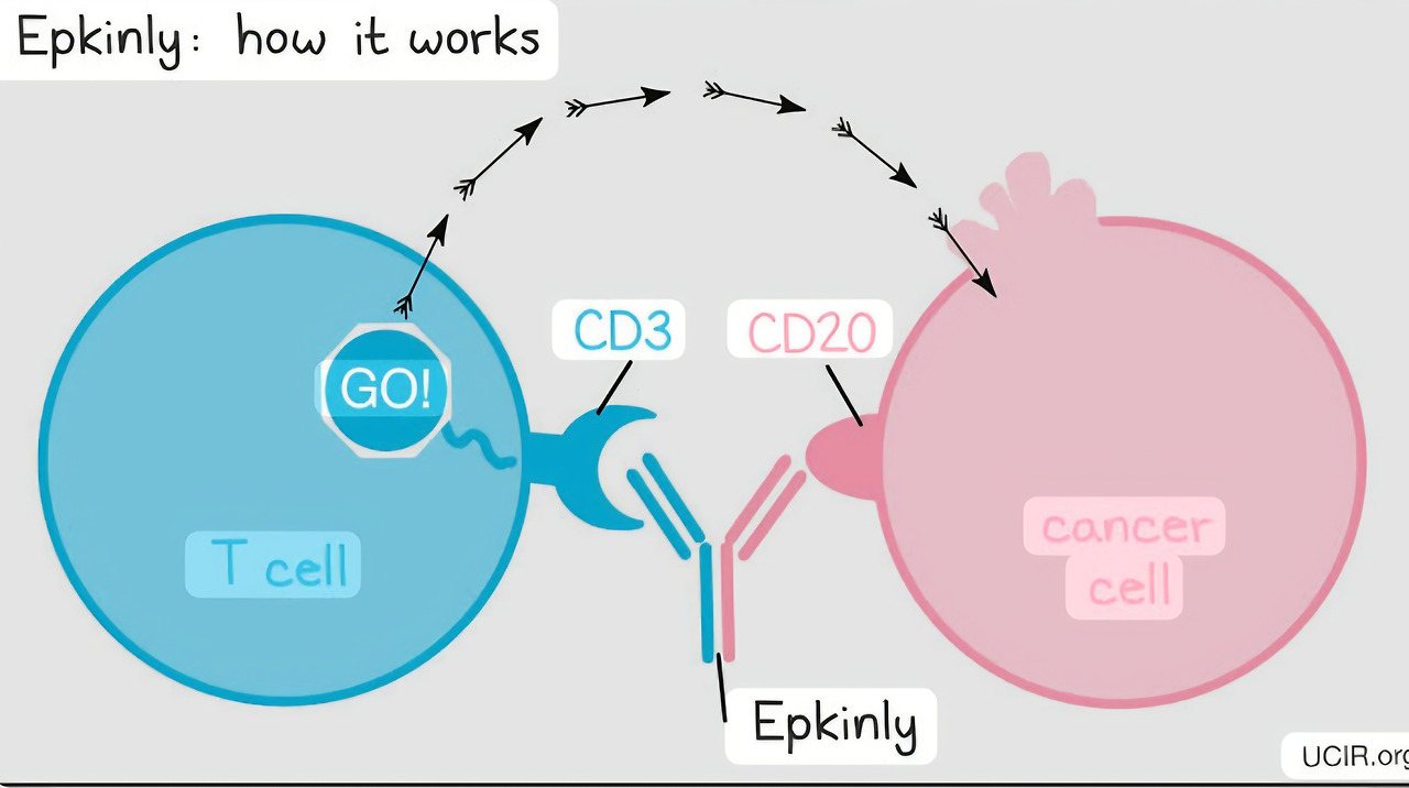 신약인 엡코리타맙은 여기선 한 단계 더 똑똑해진 아이다. 요새 암 치료의 트렌드라고 하는 면역 치료인데, 내 몸 속의 면역세포를 활성화 시키고 따라서 부작용은 최소화 하는 것이다. 이 약제에는 팔arm이 두 개가 달려 있는데, 한 팔로는 위에서 말한 암세포인 CD20을 잡고, 나머지 한 팔로는 암세포를 죽이는 세포인 T-cell의 CD3을 잡는다. 그리고 이 두 세포를 붙여놓는다. 즉, 암 세포를 죽이는 세포가 암 세포를 직접 대면해서 공격할 수 있도록 해 주는 것이다.