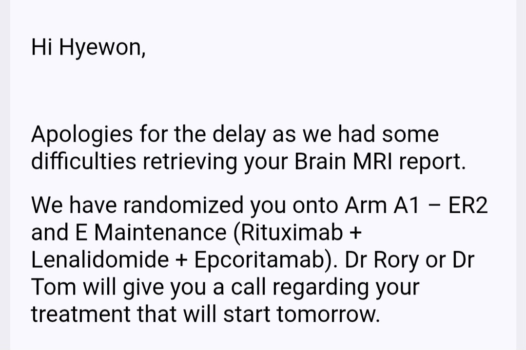 신약 그룹에 배정되고 싶었다. (신약, 이라고 하기엔 나온 지 몇 년 되긴 했다) 물론 신약을 사용한다고 모든 게 만사 오케이인 것은 아니다. 엡코리타맙 Epcoritamab 이라는 약이 효능이 좋다는 것은 그 동안의 임상과 치료를 통해 밝혀져 왔지만, 재발이 아닌 ‘신규’ 진단된 여포성 림프종에 사용하는 것은 세계 최초이다. 그에 따른 어떤 위험이 있을지는 아무도 모른다. 하지만 아무래도 기존의 항암치료제보다 몸에 부담이 훨씬 적다고 들어서 시도해보고 싶었다. 스페셜리스트의 확신에 찬 추천도 한 몫 했다. 그는 거짓말을 못 하는 사람이라는 걸 이제 알아버려서.