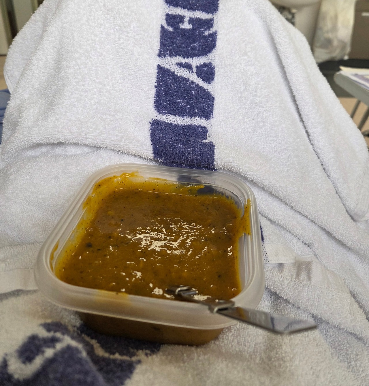 오늘 첫 리툭시맙을 얼마나 천천히 넣을 건지, 중간에 부작용이 생기면 어떻게 조절 할건지를 Jo가 정성 들여 설명해 주었다. 그리고9시쯤 시작한 리툭시맙은 한방울 한방울 인내심을 잔뜩 품고 떨어진 후 느릿느릿 내 혈관으로 들어왔다. 몽롱했던 탓에 정확히 기억이 안 나는데 오후 3시가 넘도록 맞은 것 같다. 다행이 맞는 동안 큰 부작용은 없었다. 혈압이 떨어져서 어지럽고 졸린 정도? 그리고 나서 수액도 한참 맞았다. 첫날이라 내내 같이 있어준 남편이 이것저것 챙겨 주었고, 교회 언니가 병원 가서 먹으라며 싸 준 호박죽도 야무지게 꺼내 먹었다. 침대를 반쯤 세워 마치 고대 로마 귀족처럼 비스듬히 누워 죽을 먹고 있으려니 이건 말 그대로 ‘누워서 식은 죽 먹기’였다. 어쩜 호박죽은 식어도 이렇게 맛있을 수 있는지. 그래, 병원 이까이꺼, 식은 죽 먹기지!