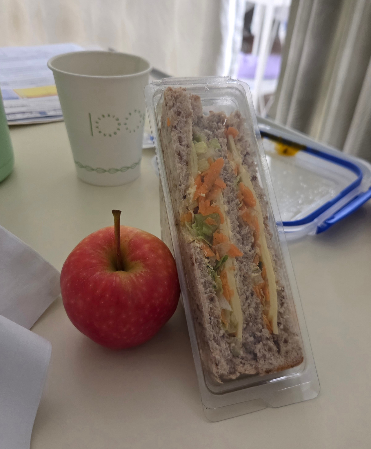 잠시 후 점심시간, 뉴질랜드 병원 점심의 현실을 간파했다. 샌드위치와 과일이었는데 샌드위치는 치즈와 당근샐러드의 오묘한 조합이었고, 과일은 통 사과. (다른 옵션은 통 오렌지였다. 아니 뭘 어쩌라고...) 이 나라에서 출산한 한국 친구들이 하나같이 병원 밥 때문에 금방 퇴원했다며 산모식이 토스트랑 아이스크림이었다고 했었는데, 직접 겪어보니 이해가 간다. 모든 치료가 다 무료에 밥까지 무료로 주는데 메뉴에 불만을 제기할 생각은 전혀 없다. 다만 나는 요거 먹고는 못 버티는 한국사람이라 매 주 바리바리 간식을 싸 와야지 싶었다.