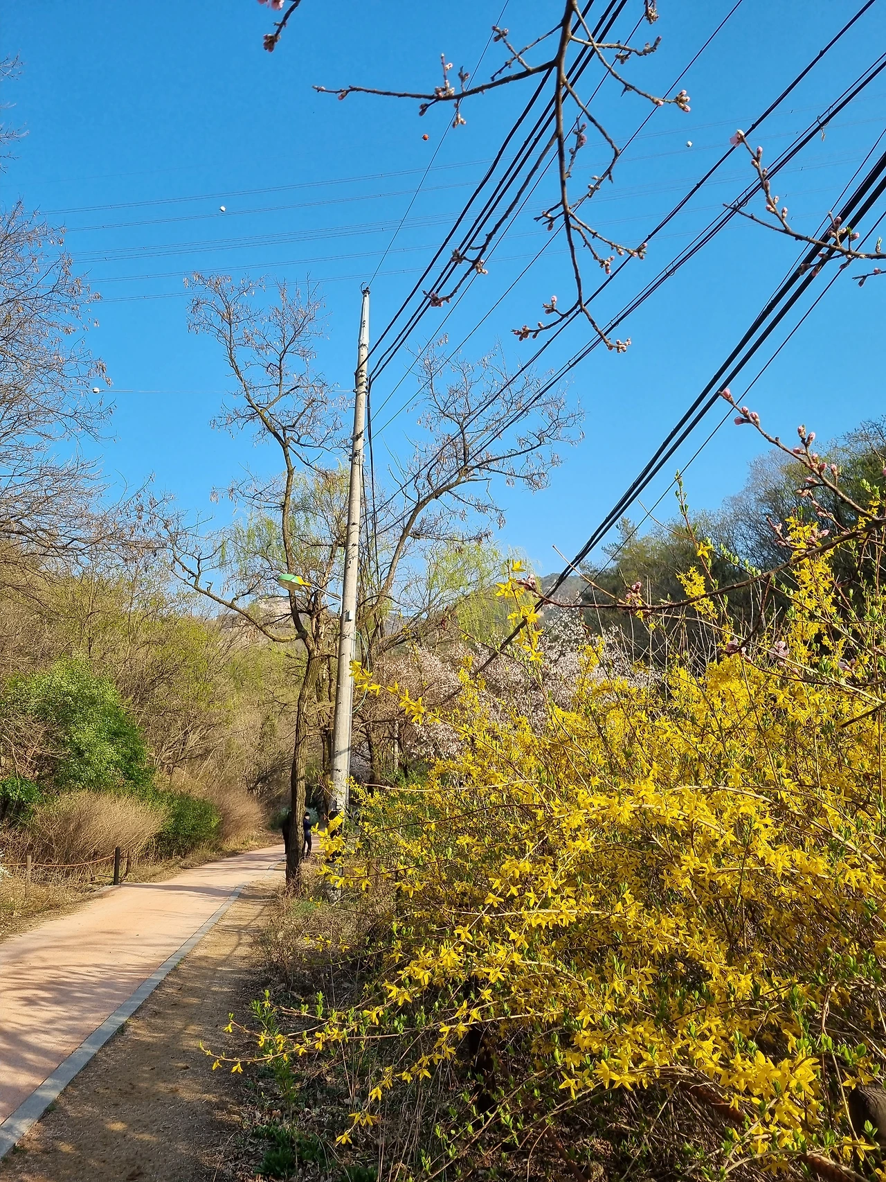 아직 피지 않은 벚꽃이 꽃봉오리를 맺고 있습니다, 그 옆엔 개나리