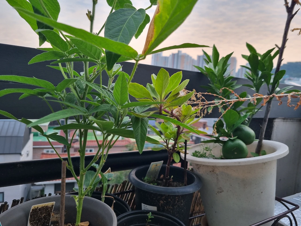 좌:콩나물이 새로운 콩나무로 변신,맨끝은 귤나무