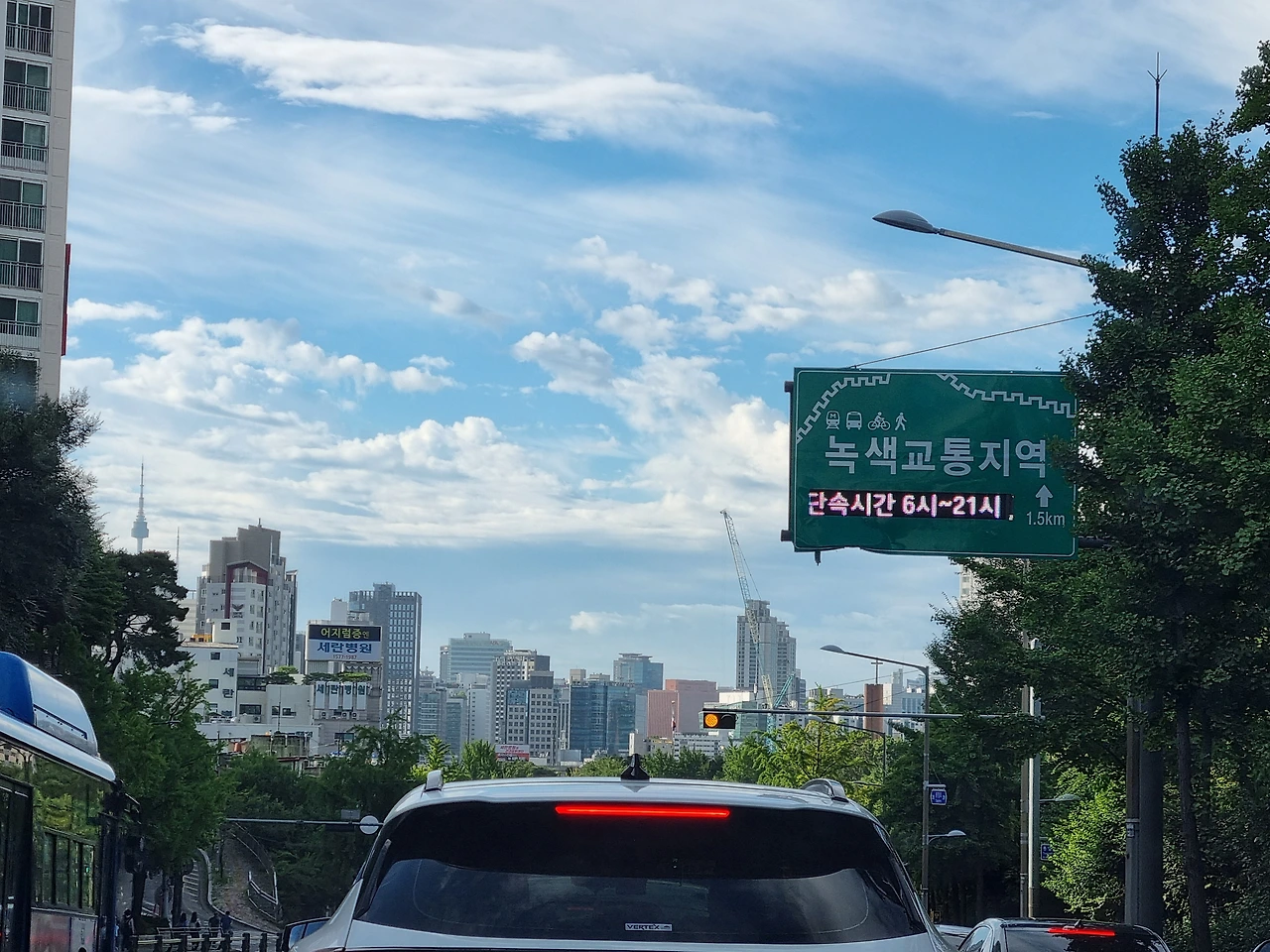 높은 빌딩 너머로 듬성듬성 보이는