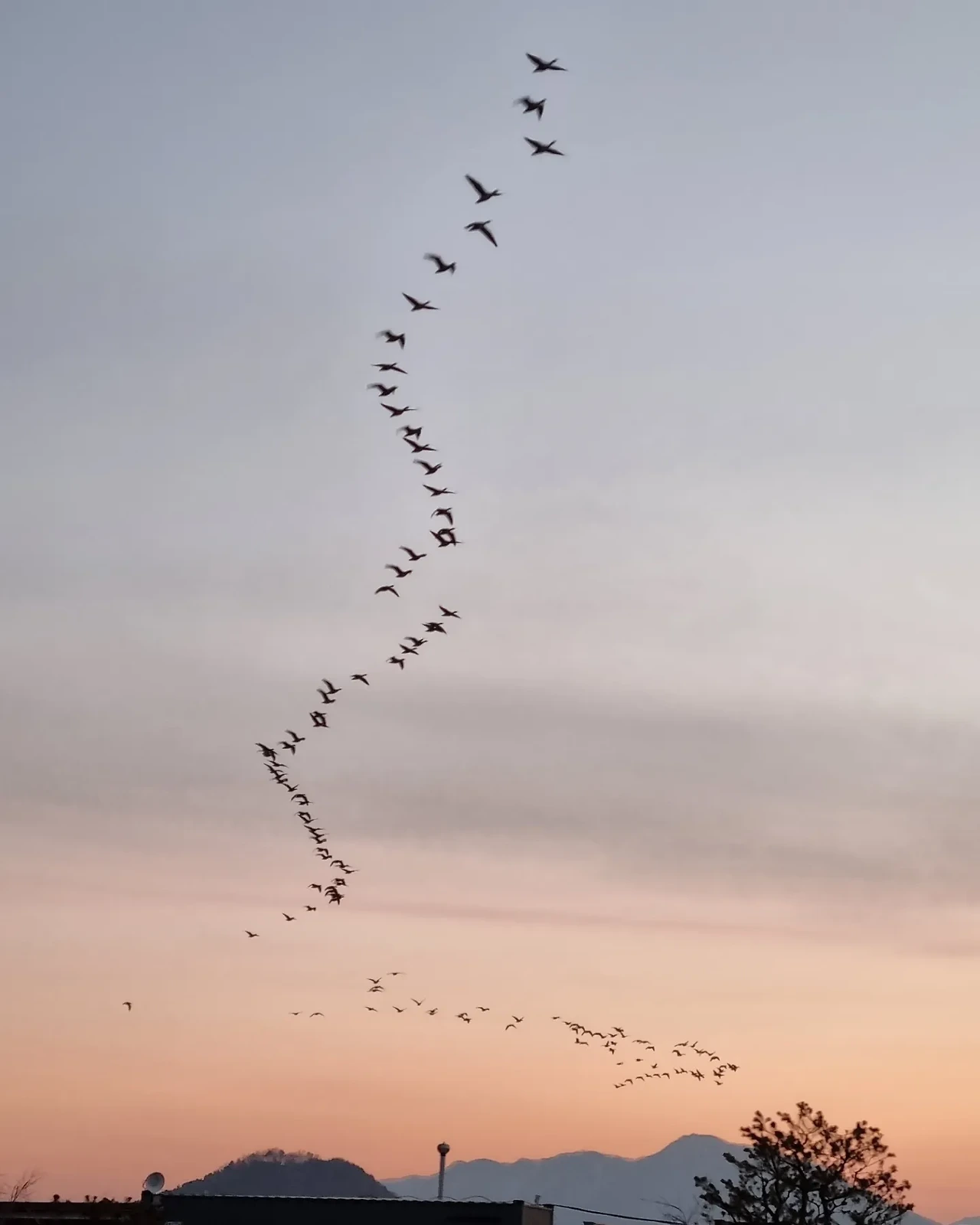 노을이 흩뿌려진 하늘에 갑자기 나타난 철새