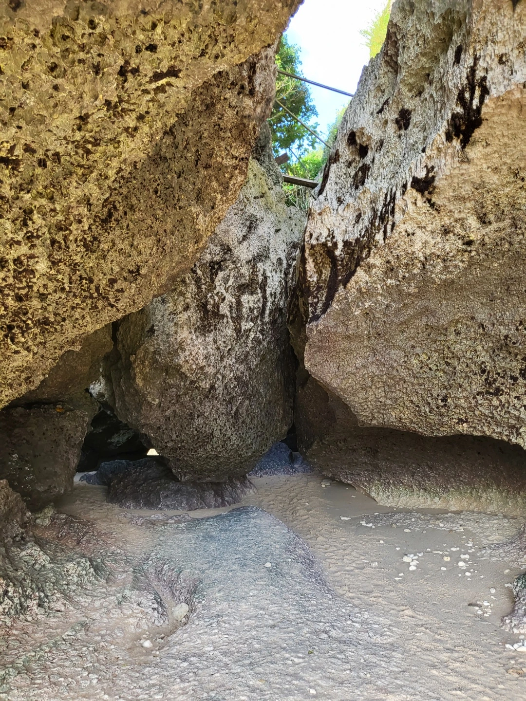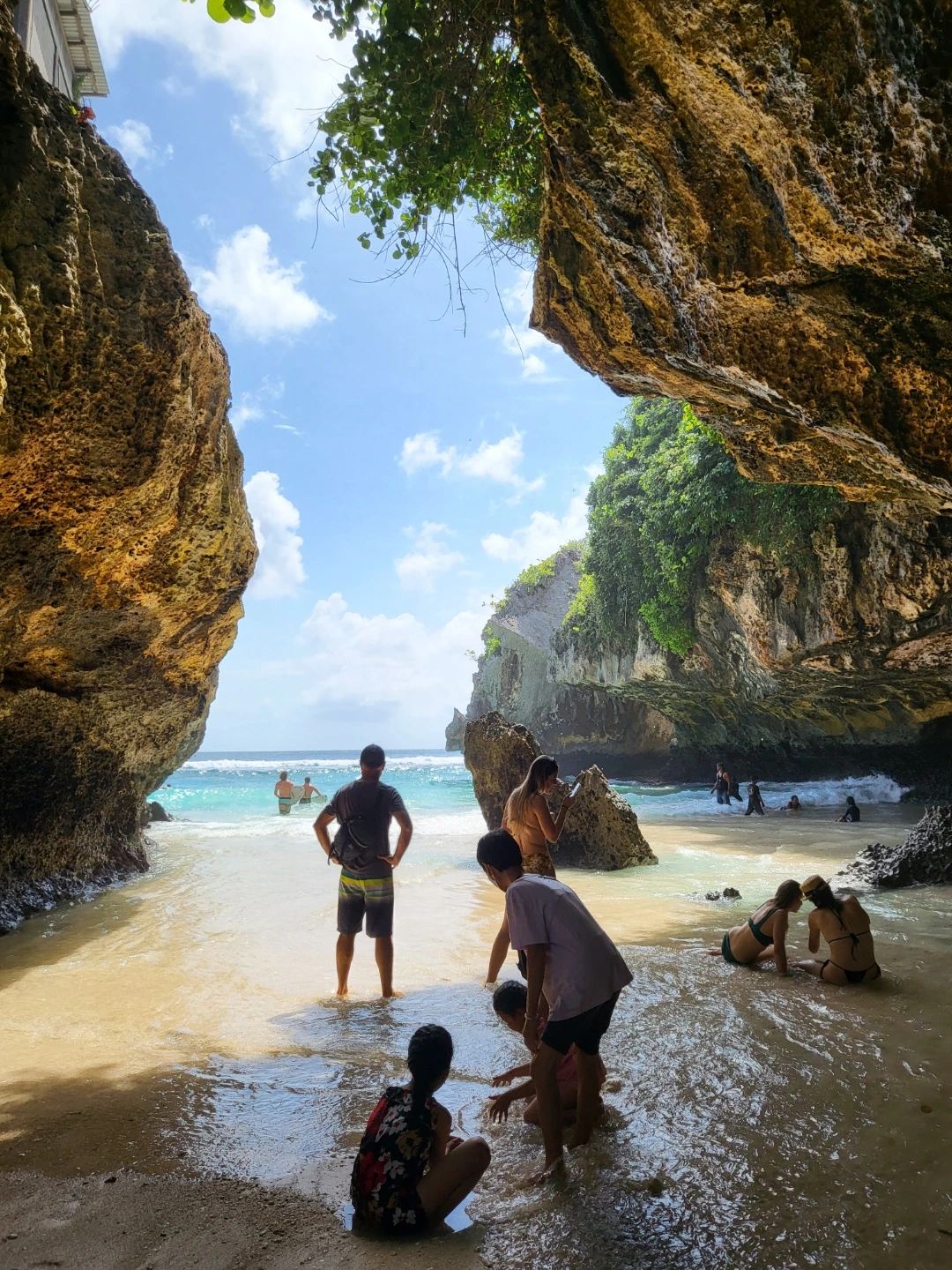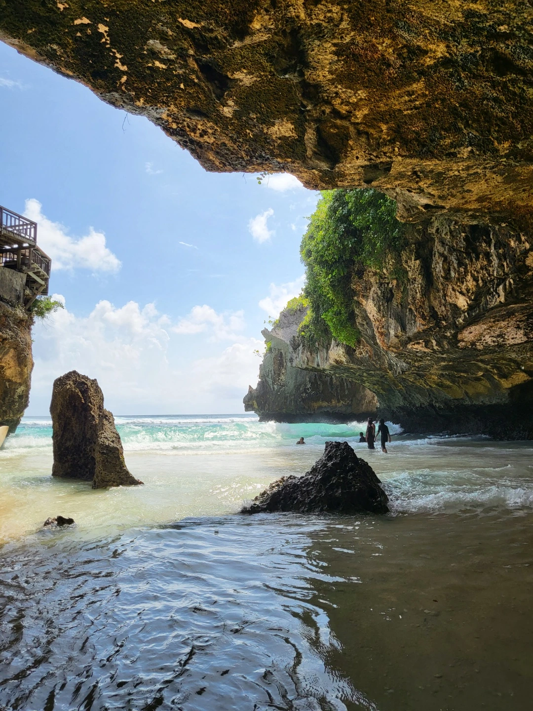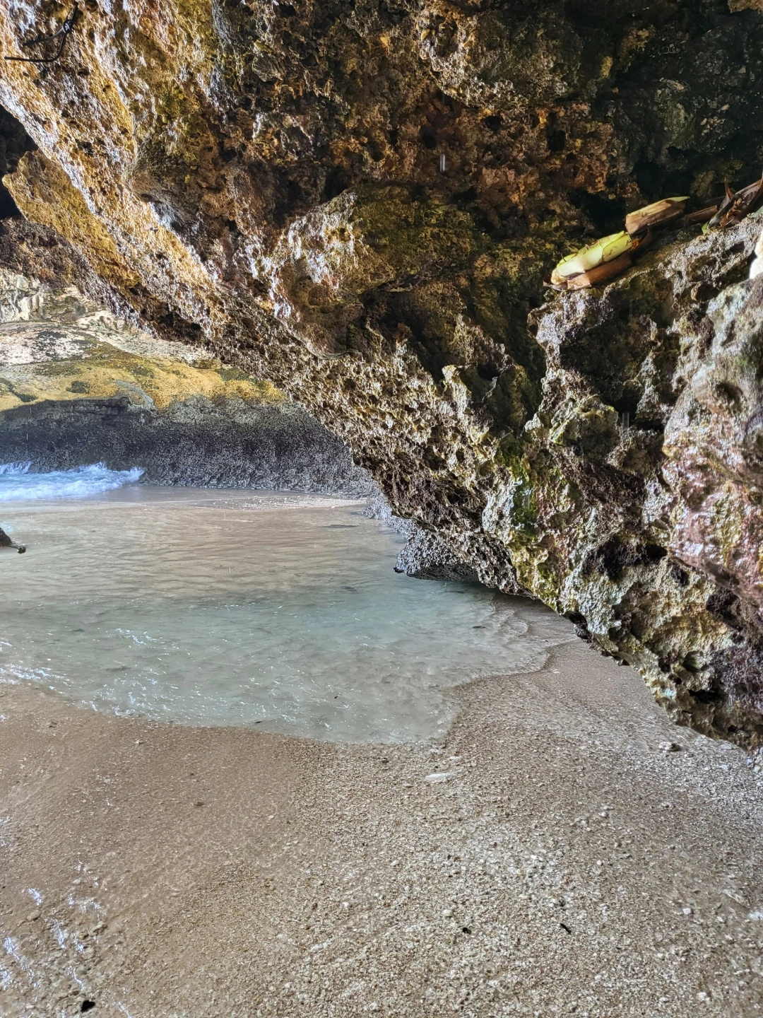 사진에서 보이는 곳에서 아쿠아 슈즈를 신고 서있었다. 발리에 오시는 분들께 아쿠아 슈즈를 강력 추천한다 ! 쿠팡에 다양한 종류가 있으니 꼭 구비하시길.. 생각보다 바닥에 발에 상처를 낼 수 있는 죽은 산호와 돌 조각이 있다. 그래도 파도가 생각보다 강했지만 수면의 높이는 매우 낮았기에 아이들도 부모님의 보호가 동반된다면 재밌게 놀 수 있는 환경이었다. 그곳에서 사람들을 구경하고 파도에 몸을 맡기다 보니 짠 바닷물을 계속해서 들이마셨다. 그렇게 시간이 가는 줄 모르고 놀다가 혹시나 하는 마음으로 동굴처럼 생긴 곳에 몸을 수그리고 들어가서 통과하니 반대편 해변가가 등장했다. 이미 몇몇 사람들이 해변가에 앉아 조용히 책을 읽거나 낮잠을 자고 있었다. 나까지 덩달아 마음이 편해지는 광경이었다.