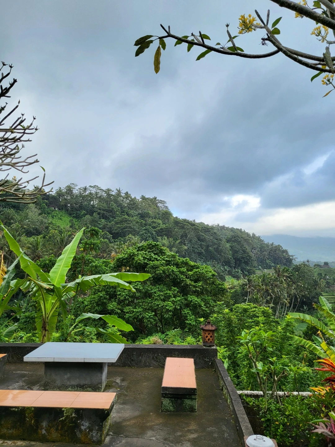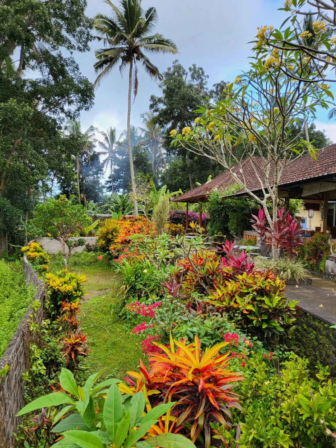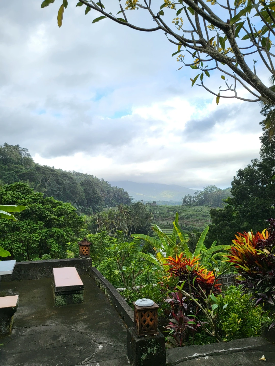 숙소 내부는 소박하게 정말 필요한 것만 갖추고 깨끗했다. 물론 전등이 매우 어두워서 잠들기 전 독서를 하기가 약간 힘들었지만, 여행 기간 동안 숙소보단 밖을 돌아다니는 것을 선호하는 우리에게 큰 문제는 아니었다. 남편이 이숙 소를 고른 이유가 한 가지 더 있었는데, 1. 숙소 내부에 위치한 인도네시아 가정식 식당(주인아주머니와 사장님 그리고 친척인 것 같은 아주머니께서 빠르게 요리를 해주신다. 2. 유명한 물의 궁전 트리타 강가가 걸어서 10분 내지. 일단 확 트인 자연경관을 바라보며 하늘을 관찰하다 보면 특정 시간에 맞춰 등장하는 새떼를 목격할 수 있다. 그들은 약간은 섬뜩하면서도 신기한 소리를 내면 한 20분 정도 배회하다 사라진다. 그리고 발리 하면 떠오르는 라이스 테라스! 저기 멀리 보이는 라이스 테라스를 구경하다 우측으로 눈을 돌리면 사장님 내외가 가꾸신 정원의 알록달록하게 꾸며져 있다.