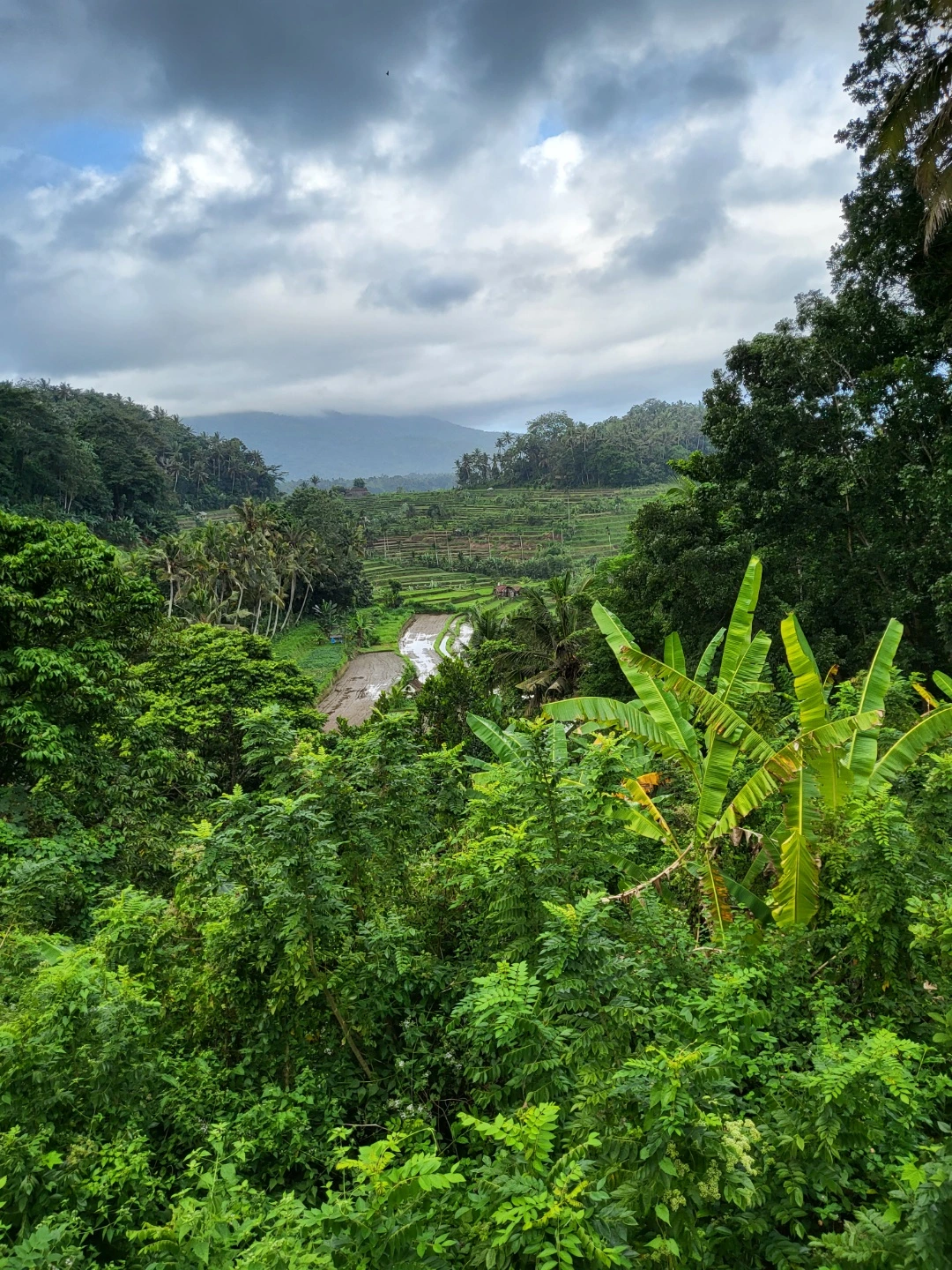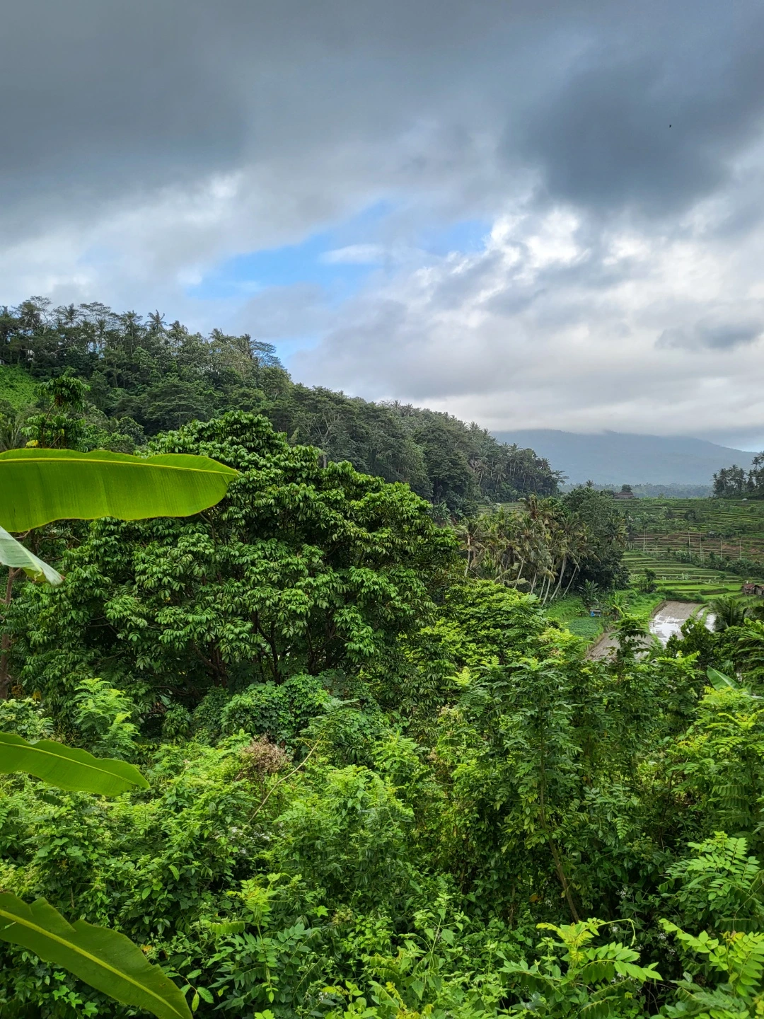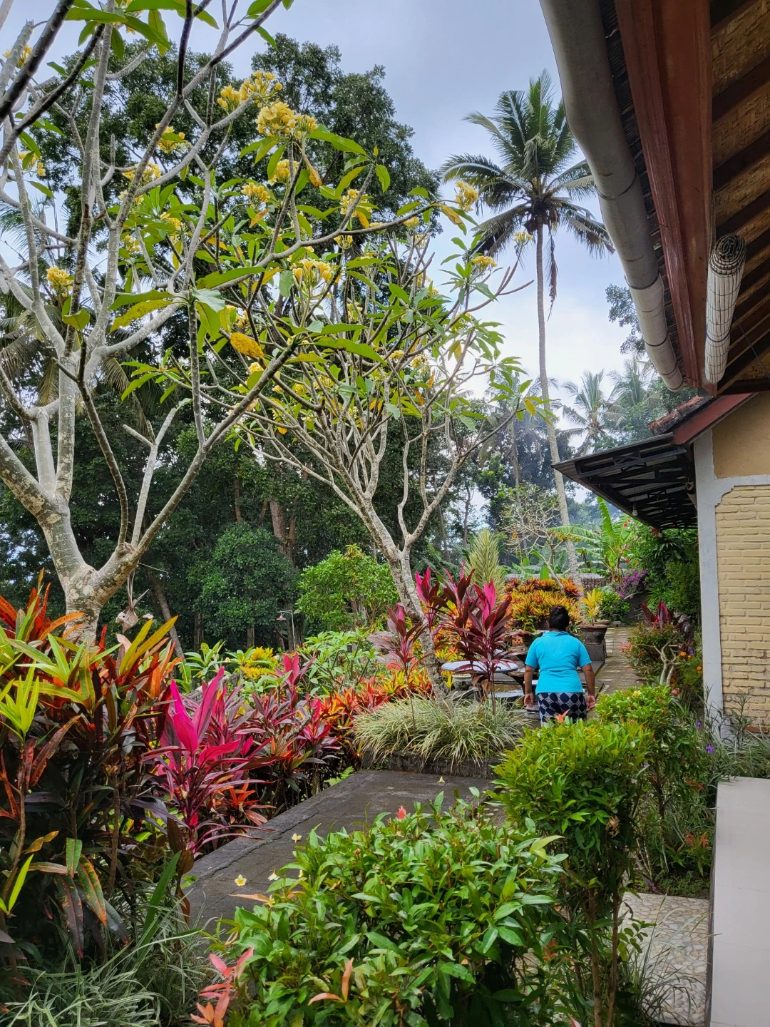 숙소 내부는 소박하게 정말 필요한 것만 갖추고 깨끗했다. 물론 전등이 매우 어두워서 잠들기 전 독서를 하기가 약간 힘들었지만, 여행 기간 동안 숙소보단 밖을 돌아다니는 것을 선호하는 우리에게 큰 문제는 아니었다. 남편이 이숙 소를 고른 이유가 한 가지 더 있었는데, 1. 숙소 내부에 위치한 인도네시아 가정식 식당(주인아주머니와 사장님 그리고 친척인 것 같은 아주머니께서 빠르게 요리를 해주신다. 2. 유명한 물의 궁전 트리타 강가가 걸어서 10분 내지. 일단 확 트인 자연경관을 바라보며 하늘을 관찰하다 보면 특정 시간에 맞춰 등장하는 새떼를 목격할 수 있다. 그들은 약간은 섬뜩하면서도 신기한 소리를 내면 한 20분 정도 배회하다 사라진다. 그리고 발리 하면 떠오르는 라이스 테라스! 저기 멀리 보이는 라이스 테라스를 구경하다 우측으로 눈을 돌리면 사장님 내외가 가꾸신 정원의 알록달록하게 꾸며져 있다.