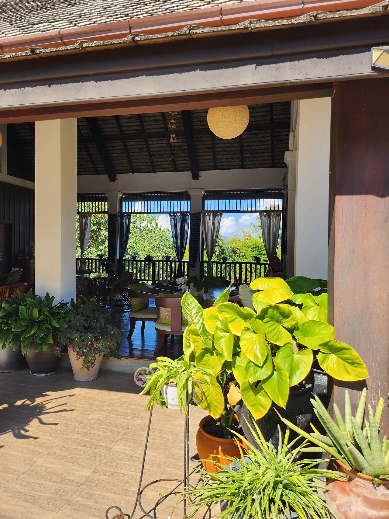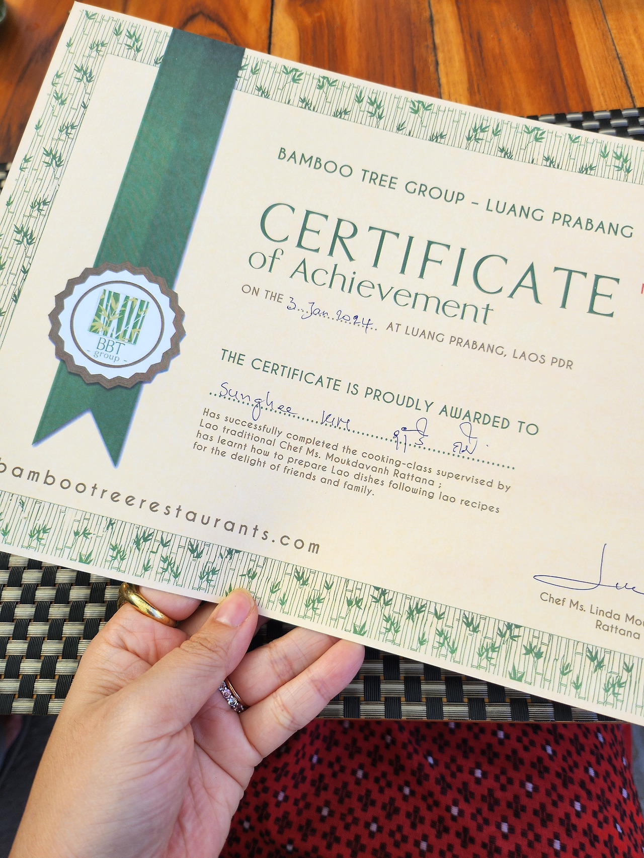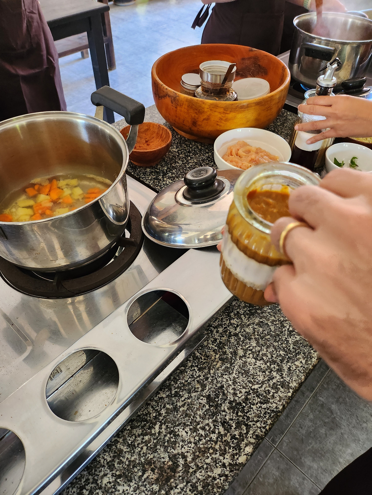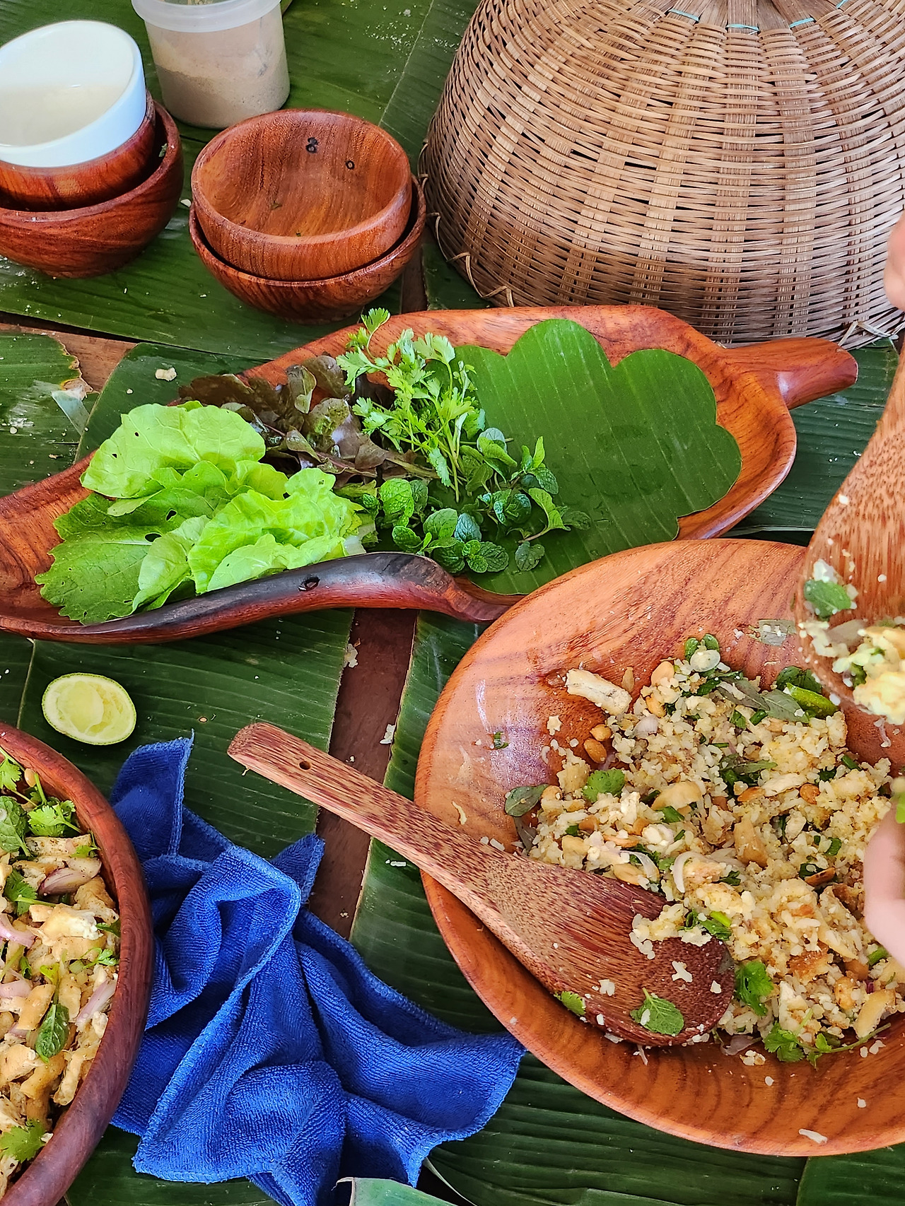 쿠킹 클래스는 오전 8시 반에 모이는 일정이었던 것으로 기억한다. 제시간에 맞춰 레스토랑으로 들어서니 9명 정도 되는 유럽 관광객들이 먼저 도착해 있었다. 우리는 테이블에 앉아 커피와 차를 마시며 수업이 시작되기를 기다렸다. 일단 우리의 예약을 도와주었던 사장님인지 직원인지는 모르겠으나 영어가 꽤나 능통했던 젊은 남자분이 오늘의 일정을 알려주었다. 일단 툭툭(동남아의 대표적인 야외 택시)를 타고 루앙 프라방 시내에서 살짝 벗어난 곳에 있는 시장을 탐방하며 라오스 음식에 주로 쓰이는 식재료들을 탐방한 후, 오늘의 쿠킹 클래스가 열리는 곳으로 이동하는 것이었다. 방문한 시장은 한국의 시장보다 더 역한 냄새가 가득했다. 어둡고 침침했으며 베트남에서 음식 투어를 할 때 방문했던 시장과 닮아있었다. 정말 다양한 채소와 새벽 일찍 문을 연다는 축산 구역은 이미 문이 닫혀 있었고, 그 외에도 마른 과일을 파는 곳도 있었다. 우리는 라오스의 대표적인 스티키 라이스(우리나라의 찹쌀밥과 비슷한 쌀밥의 종류)를 만드는 찹쌀을 구경하고, 버펄로 껍질 튀김을 먹어보고 비교적 서양인들에게 생소한 채소와 식재료를 돌아보며 오전 시간을 보냈다. 다시 툭툭를 타고 밤부 레스토랑 소유의 농장과 야외 레스토랑이 같이 있는 곳으로 향했다. 이 레스토랑의 쓰임은 잘 모르겠지만 아무래도 중요한 행사를 위해 사전 예약을 받고 특별한 경우에만 사용하는 레스토랑 같았다. 1층에는 쿠킹클래스에 최적화되어 있는 구조로 큰 식탁에 앉아 셰프님의 설명을 들은 후 직원들이 나눠주는 재료를 가지고 똑같이 따라 할 수 있었다. 재료를 손질하고 어떻게 손질 한 재료를 다루는지, 튀기거나 끓이거나 찌거나 다양한 한 조리 방법을 거쳐 완성된 먹음직스러운 음식들은 위층 야외 테이블로 옮겨졌고 수영장이 있는 큰 야외 공간에서 맛있는 음료와 함께 요리를 맛볼 수 있었다. 쿠킹 클래스 치고 조금 비싼 감이 있었지만 스티키 라이스를 만드는 방법(물론 한국 집에서 하기는 어렵습니다... 마당과 대나무 재료가 있다면 모를까)을 구경하고, 갓 지은 스티키 라이스와 함께 오묘하고 섬세한 다양한 요리를 맛볼 수 있는 것은 이 쿠킹 클래스의 큰 이점이었다.
