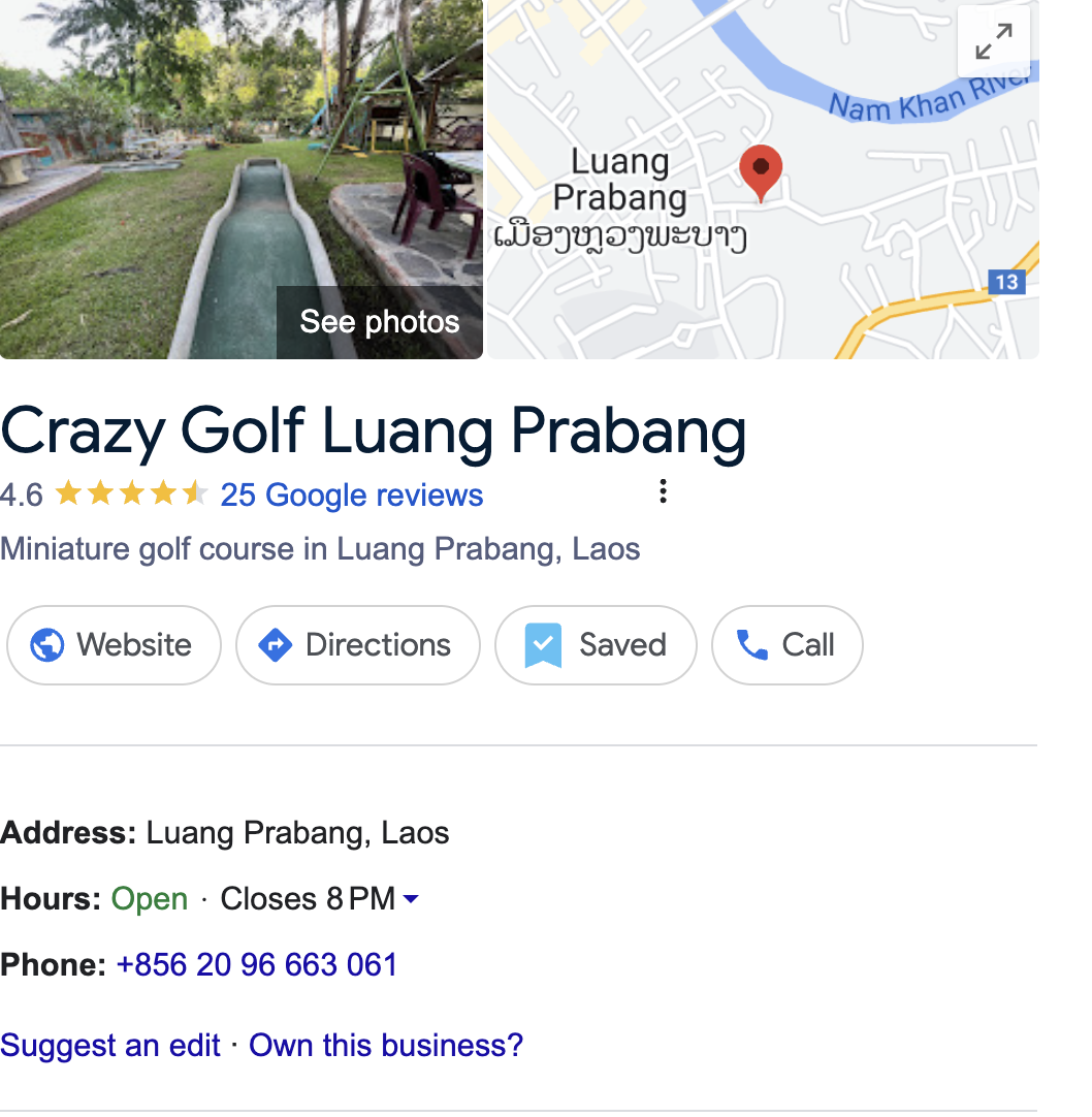 남편은 루앙프라방에 도착하기 전부터 크레이지 골프에 대해 언급했다. 한국에서는 찾기 힘든 (제가 알기로는 한국에는 크레이지 골프를 운영하는 곳이 없는 걸로 압니다만은.. 혹시 아시는 분은 알려주세요) 크레이지 골프는 미국에서는 대중적이고 유명한 놀이이며, 영국이나 유럽에서도 꽤나 알려져 있는 미니 골프다. 우리가 찾은 크레이지 골프장은 영국 할아버지가 운영하시는 곳이었는데. 유아기의 아이들을 돌봐주는 영어 학원& 데이 케어 학원과 연결되어 있었다. 시원한 냉장고에 있는 물이나 맥주, 음료를 선택해서 마시며 우리가 원하는 만큼 놀 수 있는 시설이었다. 일단 크레이지 골프는 1부터 13까지의 장애물이 있는 코스를 거치는 꽤나 재미있는 야외 활동이다. 루앙프라방의 시내에서 걸어서 20분 정도 걸리는 곳에 위치해 있으며, 차로는 10분 안에 도착할 수 있는 곳이다.