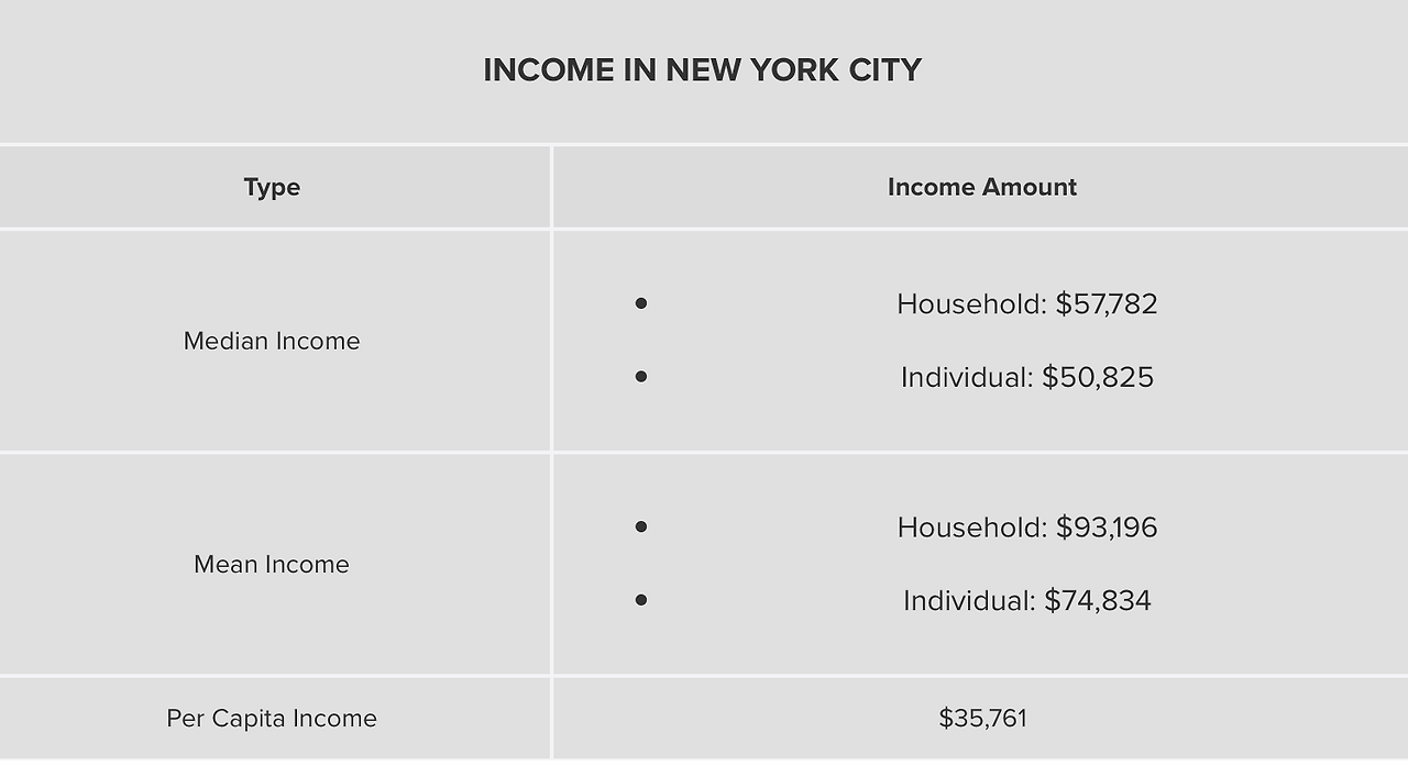 2018년 기준 뉴욕시의 일인당 평균 소득은 $74,834이다. 통계치의 중간값은 $50,825이다. 뉴욕 평균 임금이 약 75,000불 정도 한다는 것이다. 이는 엘에이 보다도 약 $5,000 정도 높은 수치로 생활비가 다소 높은 뉴욕시의 실정을 반영한 것이다.