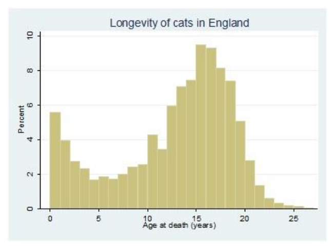 사망 시점의 나이를 보면 15~16살에 사망하는 고양이가 가장 많았고, 초기 생애인 0~1살에 사망하는 비율도 높아 이원화된 분포(bimodally distributed)를 보였다.