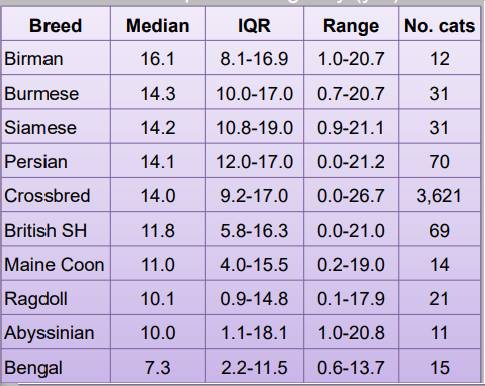 종별 수명은 버만 고양이가 평균수명 16.1세(12마리)로 1위를 차지했다. 이어 태국 품종인 버미즈 고양이 14.3세(31마리), 샴 14.2세(31마리), 페르시안 14.1세(70마리), 이종 교배종(Crossbred) 14세(3621마리), 브리티시 숏헤어 11.8세(69마리), 메인쿤 11세(14마리), 랙돌 10.1세(21마리), 아비시니안 10세(11마리), 벵갈 7.3세(15마리) 순으로 나타났다. 종별로 평균수명은 큰 차이를 보였지만 개체수가 적어 일반화한 결론을 내리긴 어려워 보인다.