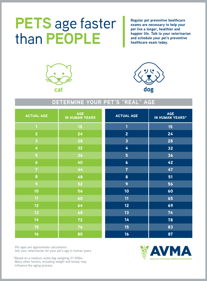미국수의사회(AVMA)가 개와 고양이의 실제 나이를 사람의 나이로 대략 환산한 표는 다음과 같다. 고양이와 개 모두 만 1~2살 사이 인간의 성년에 이르게 된다. 보통 태어나 6개월까지 유아기(kitten), 6개월~한 살까지를 아동기(junior)로 보는데 보통 18개월이면 신체적으로 어엿한 어른이 되는 것이다.