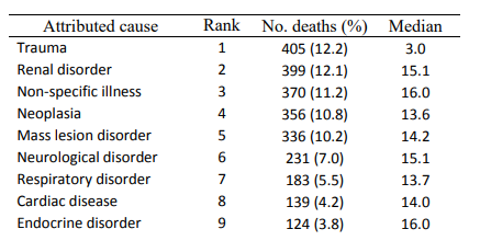 영국 왕립수의학교(Royal Veterinary College) 소속 연구진(*)은 2009년 9월 1일부터 2012년 12월 20일까지 90개 동물병원에 내원해 1차 치료를 받은 11만 8016마리의 고양이를 대상으로 종, 성별, 나이, 중성화 여부, 보험가입 여부, 체중, 질병 상태 등을 조사해 2015년 연구결과를 내놨다. 이 기간 사망한 3,309마리 고양이의 사망 원인을 분석한 결과 1위는 외상(405마리, 12.2%)이었고, 2위가 근소한 차이로 신장 질환(399마리, 12.1%)이었다. 이어 3위는 원인불명(370마리, 11.2%), 4위 악성종양(356마리 10.8%), 5위 종양 유래 질병(336마리 10.2%) 등이었다. 질환이 아닌 외상을 제외하면 신장질환이 1위이고, 1~5위(합 56.5%) 중 부위를 특정할 수 있는 질병도 신장질환이 유일하다.
