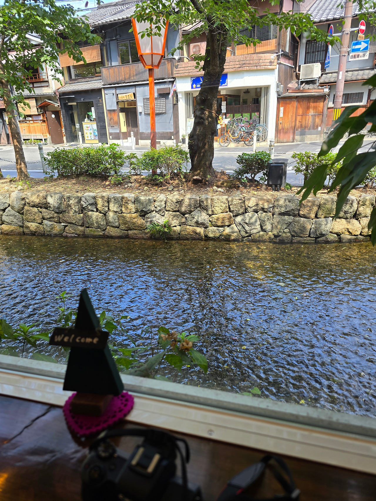다시 숙소가 있는 산조 거리 쪽으로 방향을 돌려 걷던 도중, 길거리 광고판에 그려진 말차 빙수 그림이 눈에 띄었다. 마침 너무 더웠던 데다, 일본에 가면 자기 대신 꼭 빙수를 먹어 달라는 대학원 선배의 말이 생각나 가게에 들어갔다. 손님이 없어 조용하지만 깔끔하고 모던한 느낌의 카페 겸 제과점이었다. 말차 빙수는 양이 조금 적긴 했지만 잠시나마 더위를 식히기엔 문제없었고 맛도 훌륭했다. 빙수 가게를 나와 걷다 보니 테라마치 거리가 보였다. 내가 가는 방향에 마침 미리 알아두었던 카페가 있어서 한번 들어가 보았다. 일반 카페 느낌은 아니었고 직원이 서빙을 해 주는 방식이었으며 약간 근대적 느낌이 물씬 나는 카페였다. 원래 카페에 들어가서 책을 펴고 일본어 공부를 좀 하려 했던 나는 분위기를 살피다 그냥 적당히 커피만 다 마신 뒤 자리에서 일어났다. 그런데 카페에 있다 보니 문득 작년에 방문했었던 시조 거리 근처 작은 카페가 생각나 그곳을 가보기로 했다. 걸어가기엔 거리가 좀 되긴 했지만 빙수 가게와 카페에서 조금씩 쉬어서 그런가 나름대로 걸을 만했다. 그 카페에 도착해서 그곳의 시그니처 메뉴인 녹차 라떼를 주문하고 앉아 일본어 책을 펼쳤다. 아기자기한 카페와 넓은 창밖으로 보이는 작은 냇물의 조화가 마음을 편안하게 해 주었다. 무더위는 잊고 잠시 평화를 즐기며 일본어 책을 보다가 손님들이 조금씩 들어오는 것 같아 그만 자리에서 일어났다.