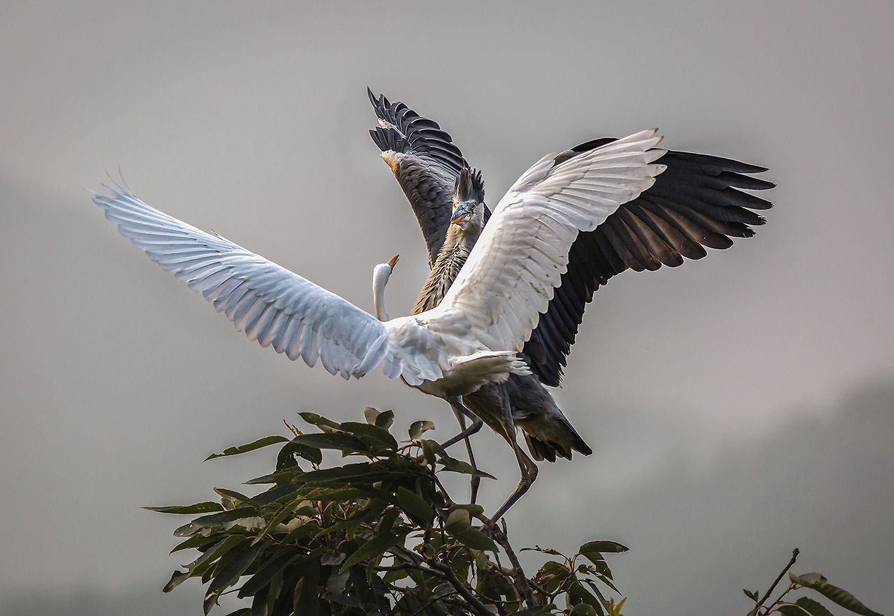 모니터에 띄워둔 사진 한 장을 한참 물끄러미 바라봤습니다. 잿빛 하늘 아래, 나무 꼭대기에서 하얀 백로와 잿빛 왜가리가 날을 세우고 있네요.