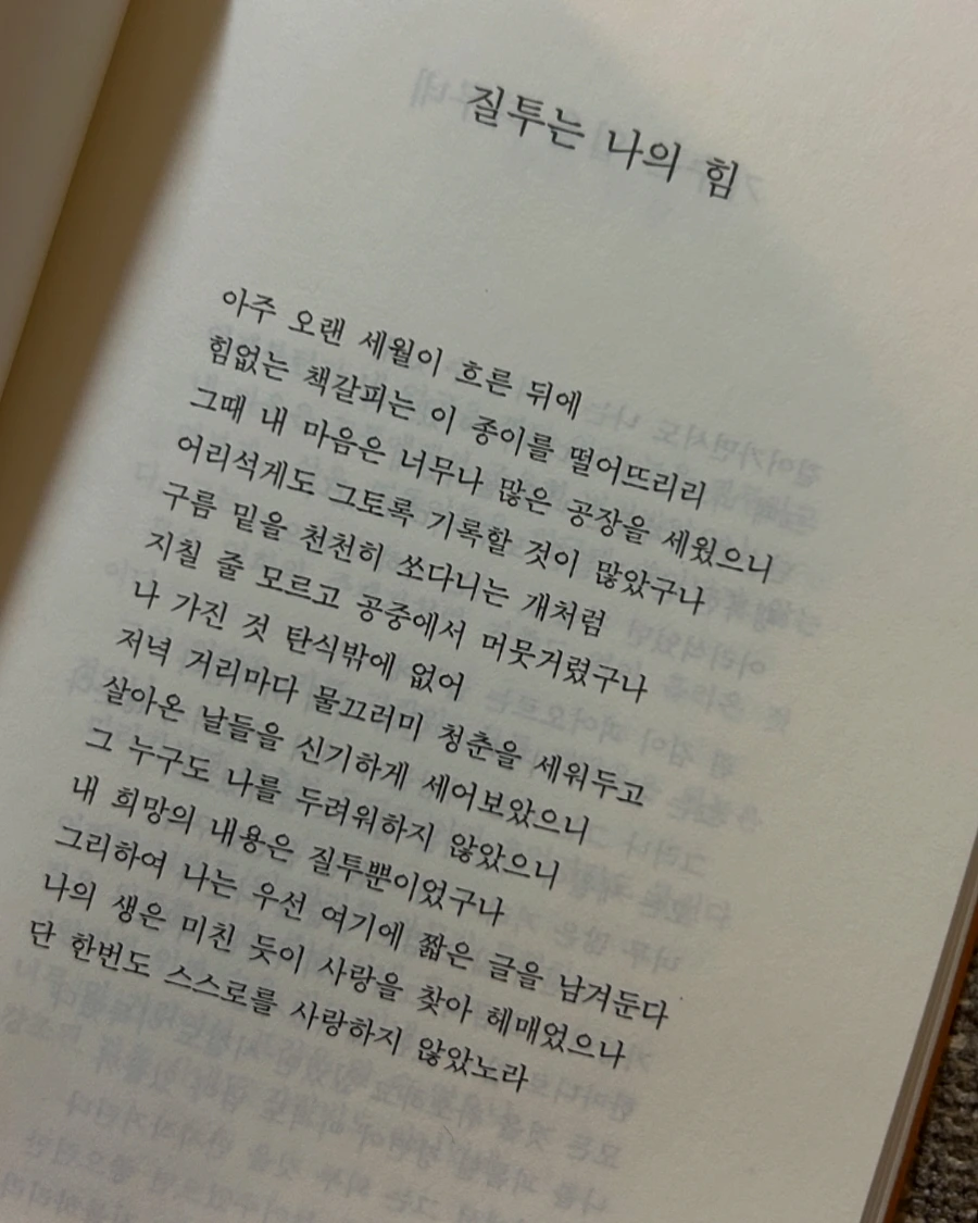 시께나 읽는 이들에겐 경전과도 같은 <입 속의 검은 잎>에서 기형도의 이 단말마처럼 새어나온 여섯 글자짜리 탄식은 수많은 이들에게 인용되어 이윽고 하나의 관용구가 되었다. 개인의 절규가 시대의 문장이 된 셈이다. 보통의 용례는 남을 부러워하는 마음을 자신의 발전의 동력으로 삼는다는 의미로 쓰이겠으나, 나의 경우에는 이 힘이 반대방향으로 작용해서 나의 질투가 아닌 ‘너의 질투’에서 힘을 얻곤 한다.