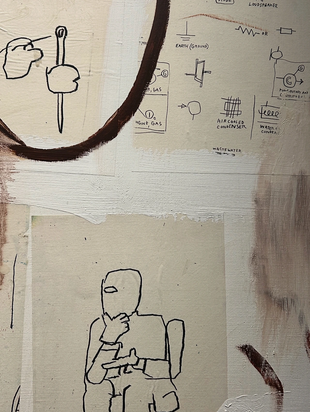 바스키아는 가리기 위해서 가리지 않고, 지우기 위해서 지우지 않는다. 밑그림 위에 여러 겹의 레이어를 덧칠하며, 숨겨진 것을 오히려 드러낸다. 겹겹의 팔림세스트 속에서, 그는 자신이 보는 것을 우리도 함께 바라보길 바란다.