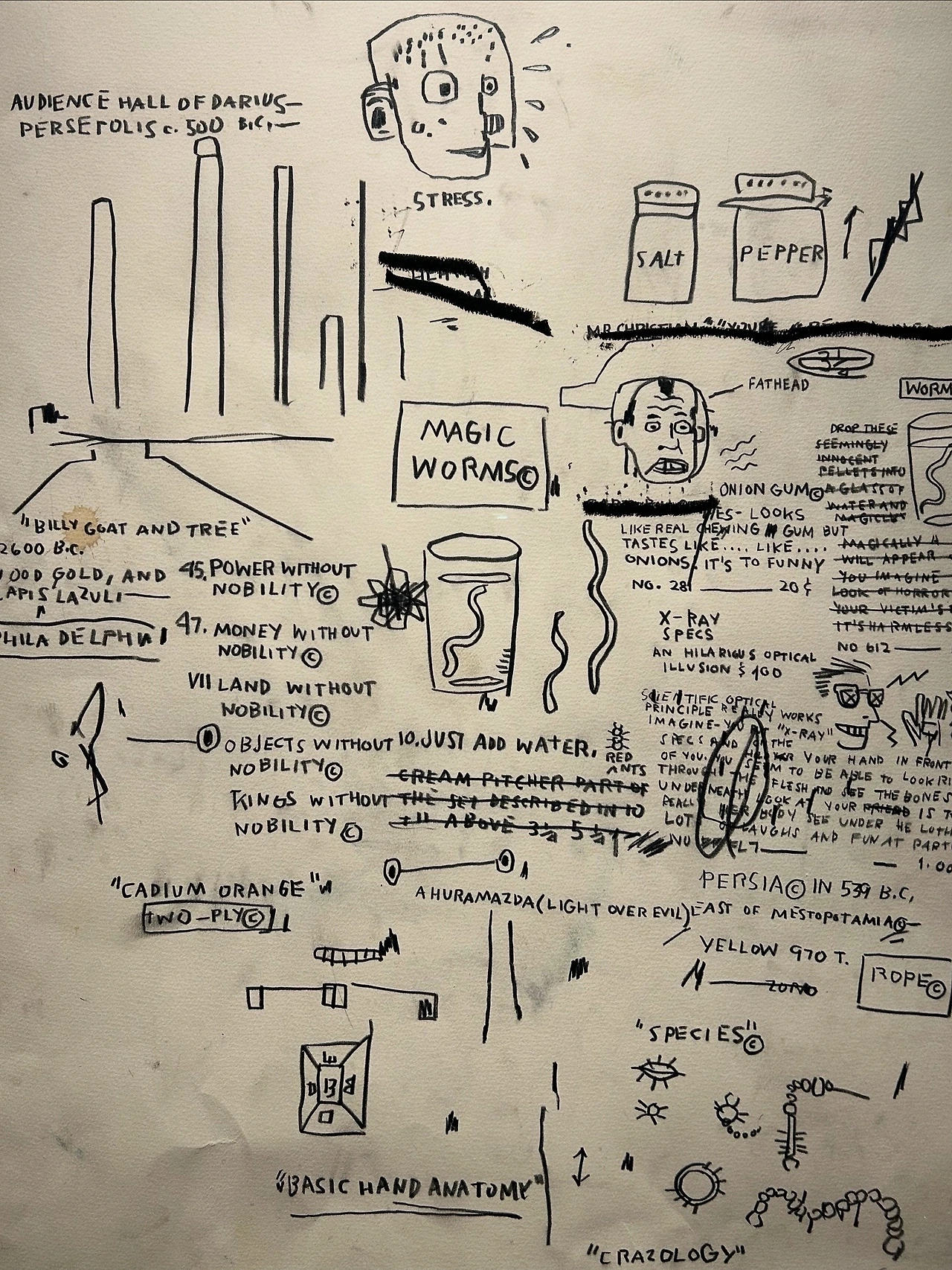 영화 <인셉션>에서도 묘사되었듯, 으레 꿈은 어떻게 시작되었는지가 모호하다. 장면들은 뚝뚝 끊기고, 개연도 맥락도 없이 여기저기서 이어붙인 듯 보인다. 하지만 기실 이 모든 이미지들은 기억과 무의식에서 온 것. 바스키아는 이 현실의 조각들을 덧칠하고 일부를 지움으로써, 우리로 하여금 기어코 그 꿈을 들여다보게 만든다.