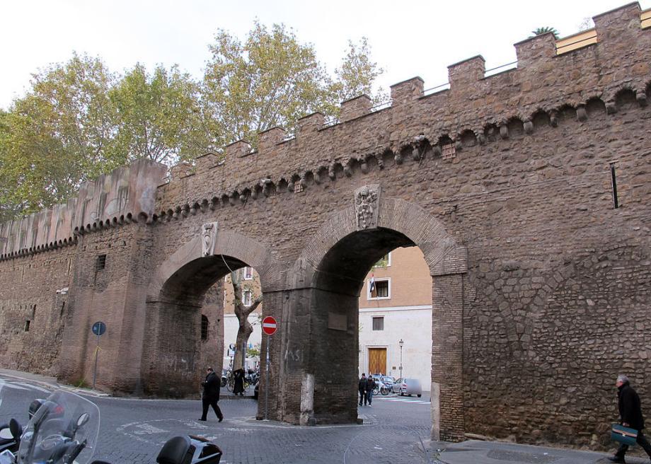 성 베드로 광장 오른쪽 열주 회랑 뒤편에는 성문이 있다. 성문을 지나기 이전은 바티칸시국 땅이고, 성문을 지나면 이탈리아 땅이다. 성문에는 긴 성벽이 연결돼 있다. 성벽 아래에는 차 두어 대가 지나갈 수 있는 좁은 도로가 있다. 고대 로마 시대에는 성벽 주변을 ‘외곽 지역’이라는 뜻인 보르고라고 불렀다.