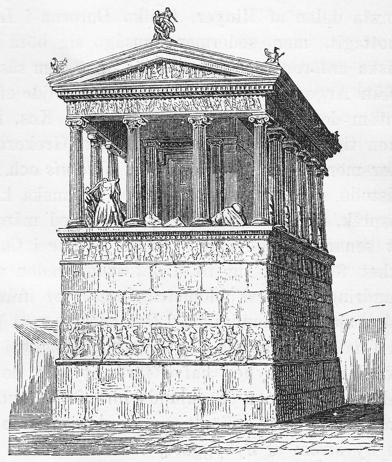 리키아의 수도 크산토스에 쳐들어간 마우솔로스는 놀란 입을 다물 수 없었다. 크산토스 한가운데에 높이가 10m 정도 되는 큰 건물이 서 있었기 때문이다. 아래쪽에 4~5m 정도의 기단이 있는데다 올라가는 계단도 없는 걸로 볼 때 신전 같지는 않았다. 그렇다고 주택이라고 할 수도 없는 건물이었다.