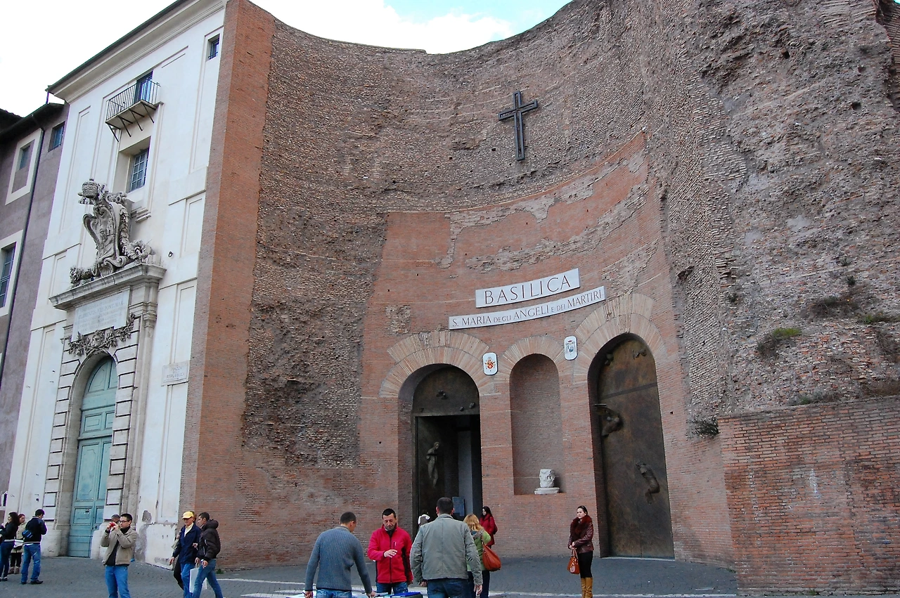 ‘성모 마리아와 천사와 순교자의 교회’는 활처럼 휘어진 모양이다. 욕장의 열탕과 온탕을 구분했던 벽을 그대로 사용했기 때문이다. 교회 안은 과거 온탕이다. 본체는 과거 냉탕 구역이다. 교회는 가로로 긴 십자가 모양이다. 교회 설계를 맡은 미켈란젤로가 원래 상태를 많이 남기려고 노력했기 때문이다.