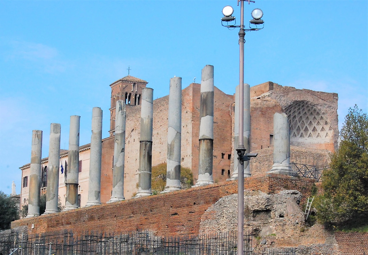콜로세움에 올라가서 포로 로마노를 바라보면 바로 정면의 언덕 위에 기둥이 길게 늘어선 건축물이 있다. 포로 로마노에서 가장 큰 신전이었다는 베누스-로마 신전이다. 사랑과 미의 여신이며 로마에는 행운을 가져다주는 것으로 알려진 여신 ‘베누스 펠릭스’(아프로디테)와 ‘로마 아테르나’에 바친 신전이다. 신화에 따르면 베누스는 그리스 연합군에게 멸망당한 트로이에서 탈출한 아이네아스의 어머니다. 아이네아스는 로마의 시조 로물루스의 조상이니 베누스는 결국 로마의 선조인 셈이다. 로마 에테르나는 로마를 지키는 여신이다. 로마라는 나라 자체를 신으로 만든 것이다.