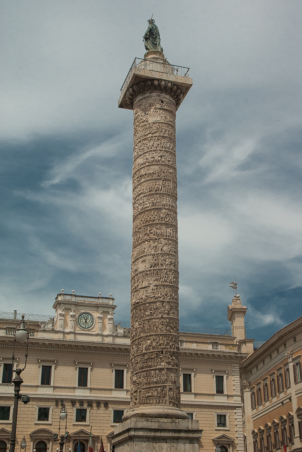 원래 원주 꼭대기에는 마르쿠스 아우렐리우스의 조각상이 서 있었다. 조각상은 16세기에 사라져 버렸다. 지금은 성 베드로 청동상이 세워져 있다. 1589년 교황 식스토 5세(재임 1585~90년)의 지시로 만든 동상이었다. 트라야누스 기둥 꼭대기에 세운 성 베드로 청동상과 균형을 맞추기 위해서 세운 것이었다.