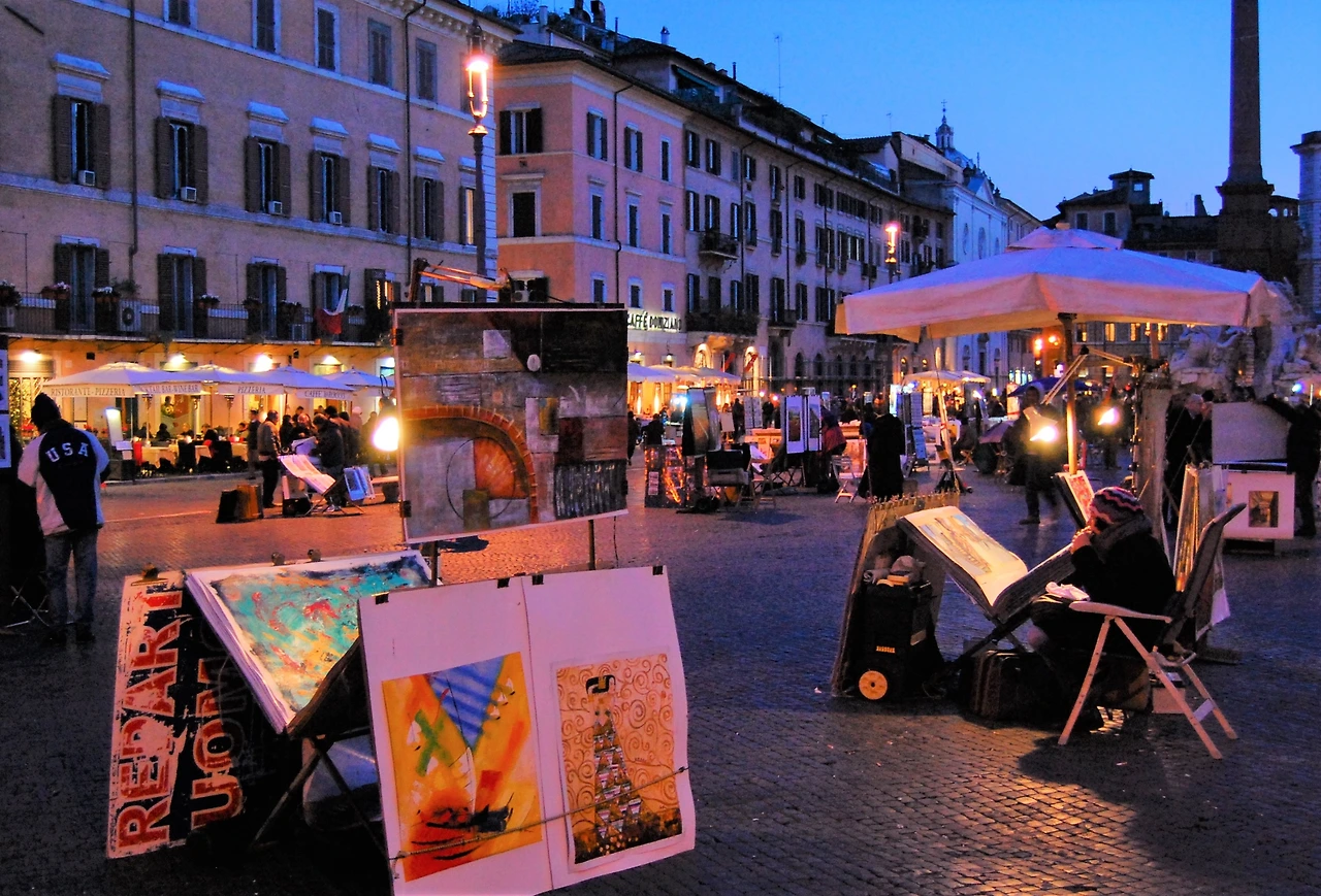나보나 광장에 어둠이 내리깔린다. 아직 하늘은 푸르스름한데 손톱만한 초승달이 떠올랐다. 이국에서 보는 매우 특이한 풍경이다. 가로등이 하나둘씩 불을 밝힌다. 언제 모였는지 이곳저곳에 거리의 화가들이 모여 그림을 그려주거나 팔고 있다.