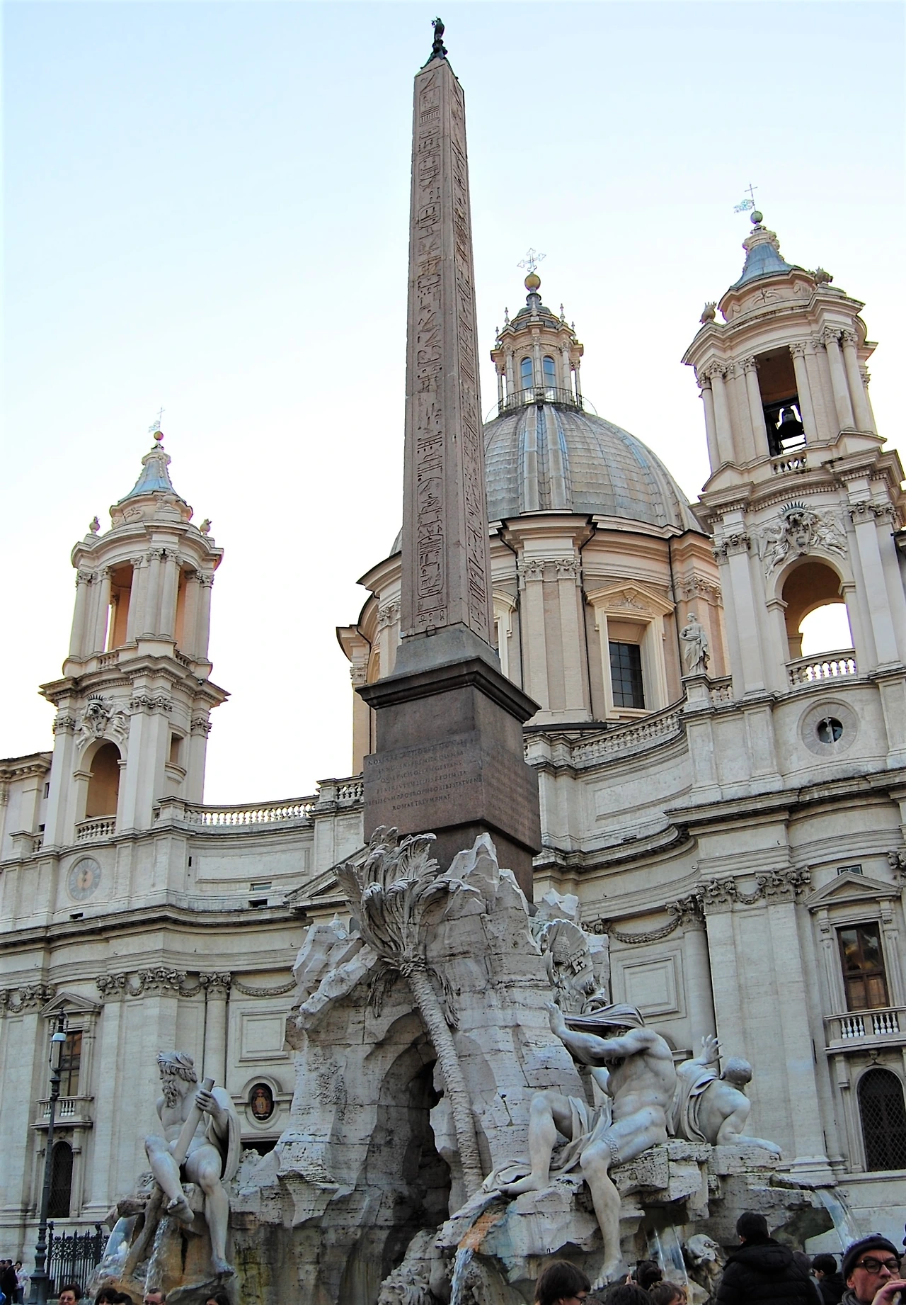 베르니니가 생각한 중앙 분수는 당시까지 로마에 건설된 모든 분수 중에서 가장 복잡했고 가장 창조적이었다. 그는 교황이 교황의 권력을 상징하는 표식으로 분수에 오벨리스크를 세우고 싶어 한다는 사실을 알고 있었다. 특히 최근 막센티우스 키르쿠스에서 발굴한 고대 이집트 오벨리스크를 원하고 있다는 것도 알고 있었다. 이 오벨리스크는 원래 도미티아누스 황제의 명령으로 이집트의 이시스 신에게 바치기 위해 주문 제작한 것이었다. 나중에 아피아 가도에 건설된 키르쿠스 막센티우스의 스피나에 세우기 위해 황제의 명령으로 로마로 옮겨졌다. 처음에는 이집트 상형문자가 오벨리스크 기단 부분에 새겨져 있었지만 로마로 올 때 지워졌다. 막센티우스 경기장이 폐허로 변한 뒤에도 오벨리스크는 그곳에 계속 서 있었다.