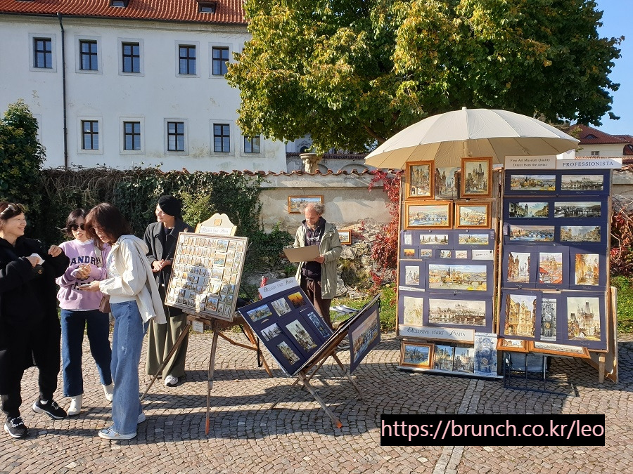 수도원 후문 쪽 공터에 작은 그림 액자 수십 개가 서 있다. 젊은 여성이 밝게 웃으며 액자를 지킨다. 옆에서는 50대 후반으로 보이는 남성이 그림을 그린다. 여성의 말에 따르면 두 사람은 폴란드에서 왔다고 한다. 그 말로 짐작해보건대 아버지와 딸일 가능성이 있다. 일부 관광객은 “예쁘다”면서 그림을 몇 점 산다. 개당 5~10유로라서 비싸지도 않다.