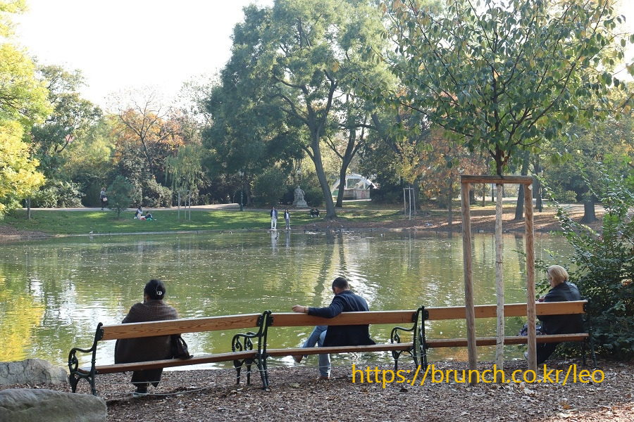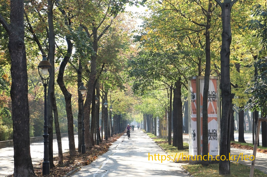잔디밭 한쪽 구석 수로 앞에 앉아 잠시 휴식한다. 아침 일찍 나와 벨베데레 궁전을 둘러보고 슈타트파크 공원까지 산책하느라 다들 많이 지친 상태다. 공원 바깥의 자전거도로에서는 안전헬멧을 쓴 할아버지와 손자가 나란히 자전거를 즐긴다.
