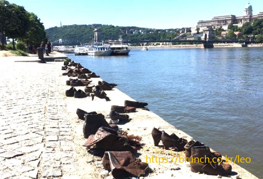 공사 중인 세체니 다리를 지나 강변으로 내려간다. 여기서 북쪽 마르기트 다리 쪽으로 가다보면 이색적인 조형물이 등장한다. 노동자의 작업화, 회사원의 구두, 여자의 하이힐, 어린이의 운동화 같은 쇠 신발이다. 이 조형물은 ‘다뉴브 강가의 신발들’이다. 헝가리어로는 치푸 아 두나 프라톤이다. ‘다뉴브 강가의 신발들’은 튀르키예 출신 영화감독 칸 토카이가 홀로코스트기념관을 보고 아이디어를 냈고, 헝가리 출신 조각가 귤라 파워가 만들었다.
