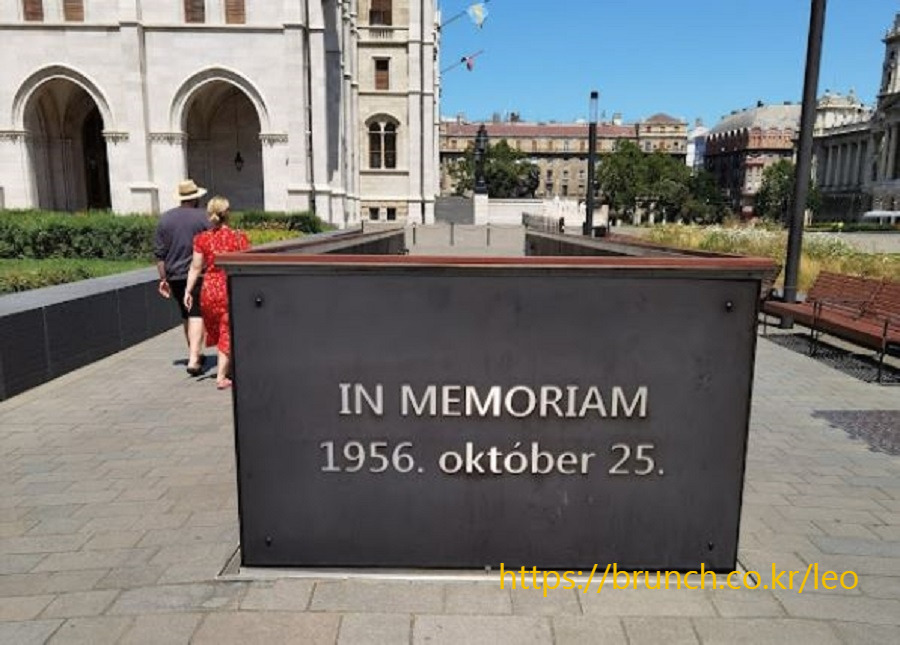 코슈트 라요수 기마상 왼쪽 모퉁이 정원에는 지하도처럼 보이는 구조물이 있다. ‘인 메모리암 1956년 10월 25일’, 즉 ‘1956년 10월 25일 기념물’이다. 헝가리가 옛 소련을 등에 업은 공산정권의 지배를 받던 1956년 10월 23일 이른바 ‘헝가리 봉기’가 발생했다. 봉기의 중심 장소는 헝가리 주권을 상징하는 국회의사당 앞 코슈트 라요수 광장이었다.