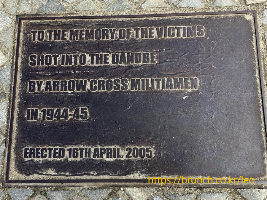 이곳에 설치된 신발은 모두 60켤레다. 주변에는 길이 40m, 높이 70cm의 돌 벤치가 있다. 3개 지점에 영어, 헝가리어, 히브리어로 쓴 안내판이 있다. 안내판 내용은 이렇다. ‘1944~45년 민병대 ‘애로 크로스’의 희생자들을 기념하며 2005년 4월 16일 건설하다’