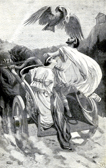 루코모의 아내 타나퀼은 기적 같은 일이 벌어지는 장면을 조용히 보고 있었다. 그녀는 에트루리아에서 조점으로 유명했던 조상 덕분에 조점을 잘 이해하고 있었다. 그녀는 남편을 다른 사람들에게서 떼어내더니 이렇게 말했다.