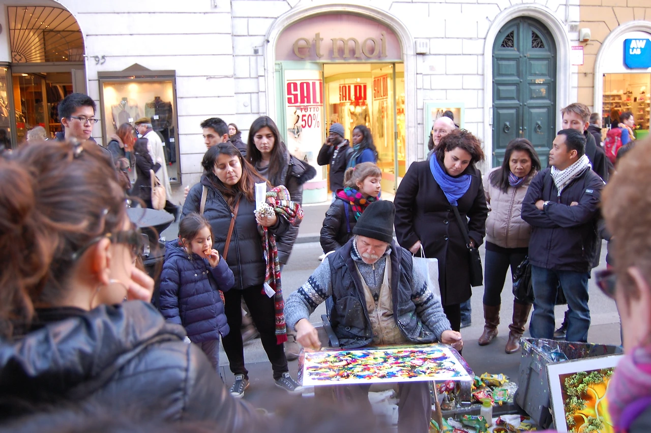 첼로를 들고 연주하는 노인, 바닥에 앉아 빵을 먹고 있는 젊은이, 남 눈 신경 안 쓰고 키스하는 데 여념이 없는 청춘남녀 등 다양한 사람들이 거리를 메우고 있다.