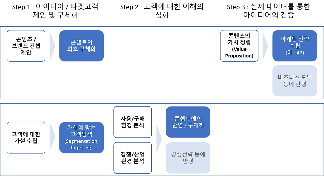 이러한 마케팅은 크게 3단계로 진행되는데, (1) 마켓 관련 요소를 발굴하고 정의하는 단계 (2) 소비자에 대한 이해를 심화시키는 단계 (3) 소비자에게 제안할 가치를 구체화하는 단계가 바로 그것이다. 이러한 프로세스는 선후가 엄격히 구분되어 있다기보다 서로 반복되고 상호작용 하면서 진행해가는 특징을 가지는데, 예를 들어 소비자를 심도 깊게 이해하다가, 다시 처음으로 돌아가서 제품에 대한 콘셉트를 고쳐 잡는 것도 얼마든지 가능한 이야기이다.