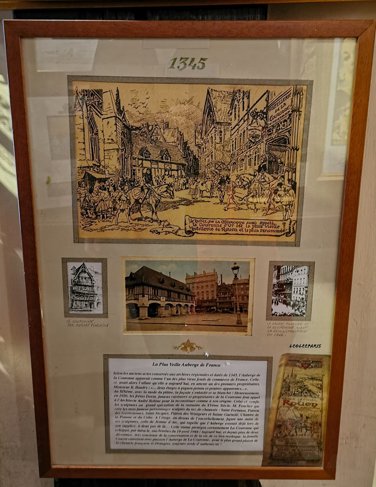 라쿠혼느라는 식당인데 왕관이라는 의미를 가지고 있습니다. 기록에 따르면 식당 종업원이 창밖으로 잔다르크가 고문당하는 것을 구경했다고 알려져 있을 정도로 루앙의 역사와 함께 한 식당입니다. 특별히 프랑스의 미식을 미국 사람들에 전파한 사람이 바로 줄리아 차일드 Julia child인데, 그분이 처음으로 프랑스 음식을 접한 곳이기도 합니다. 이곳의 식당을 맛보고 난 뒤에 미국으로 돌아가 식당을 세웠는 데, 2차 세계 대전 이후 부유한 미국 부호들에게 프랑스라는 곳에 대한 이미지가 확실하게 심어지는 결정적인 역할을 했습니다.