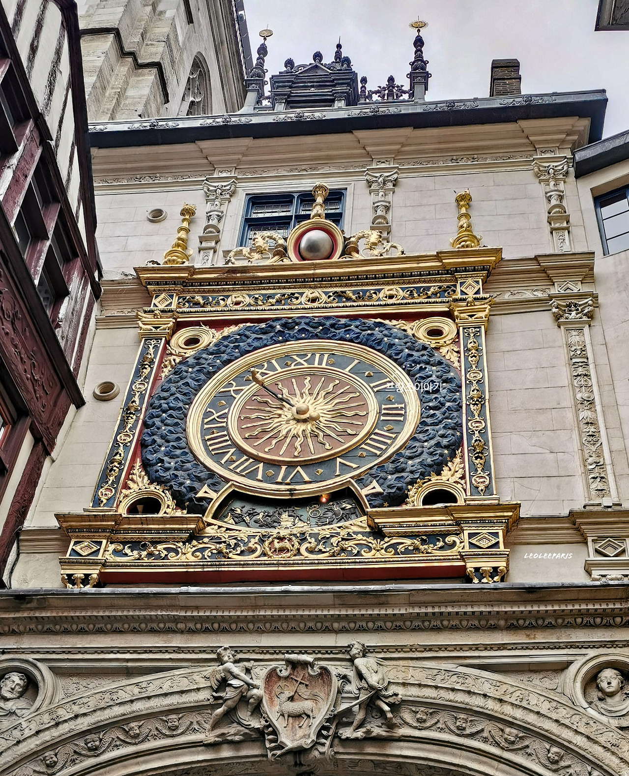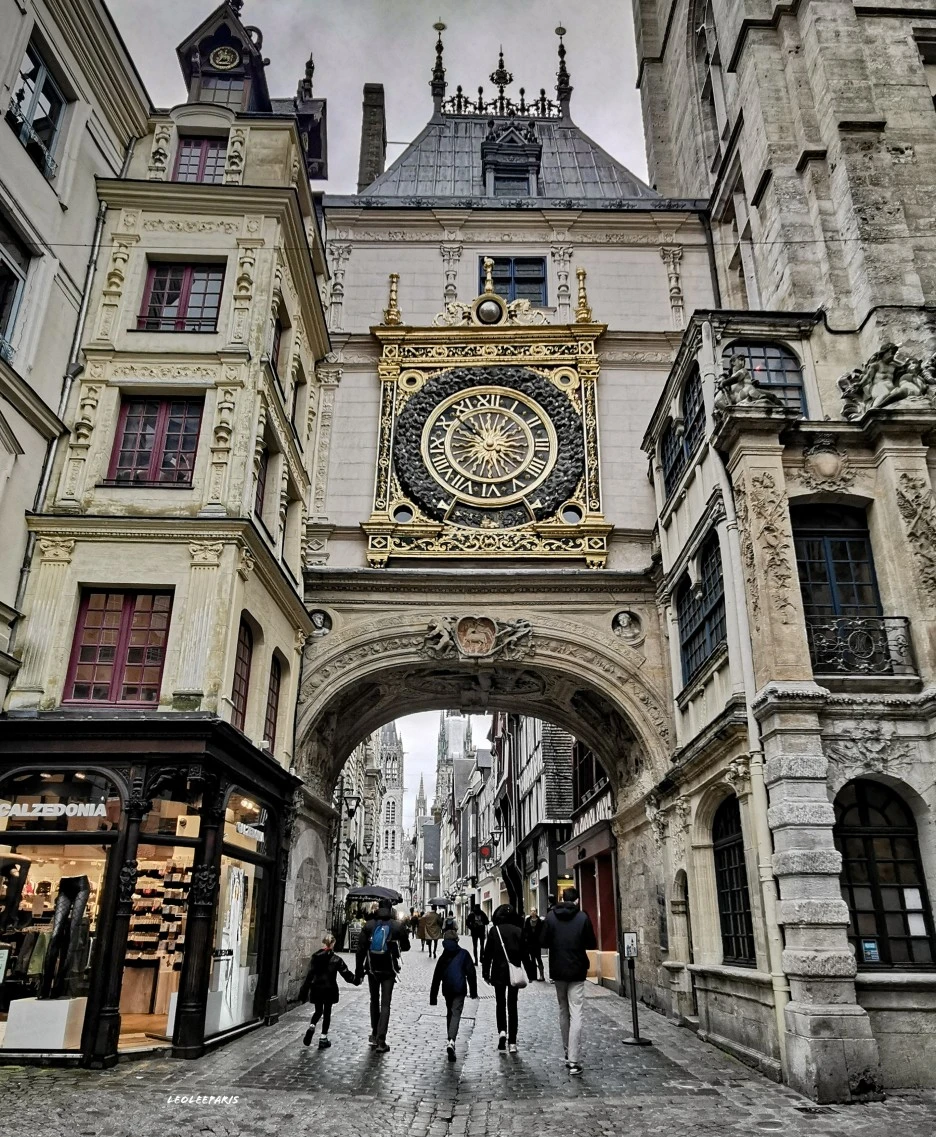 대시계탑 Gros-Horloge으로,기존에 중세 시대의 시간을 알려주는 종탑이 있었던 자리에 14세기에 시계가 생겨났습니다. 단조로운 형태의 시계에 르네상스 형태의 금빛 장식이 더해져서 완성도 높은 지금과 같은 형태가 만들어졌고, 분침 없이 시침으로만 시간을 알려주고 있고, 시기적으로 비슷한 평가를 받는 웰스 대성당의 시계보다 2배 정도 크다는 점이 높이 평가할 점입니다.