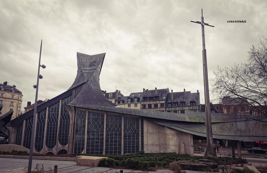 1979년 그녀를 기념하면서 교회를 세웠는데요, 지붕의 모양을 눈여겨보면 한 쪽으로는 노르망디 지역을 점령했던 바이킹족의 배를 뒤집어 놓은 모양과 잔다르크가 화형당한 불꽃 모양으로 보이는 것이 특징입니다. 성당 내부는 2차 세계 대전 때 없어진 16세기 생 방생 saint vincent 교회의 스타인 글라스를 가져와서 화려하게 장식되어 있습니다.