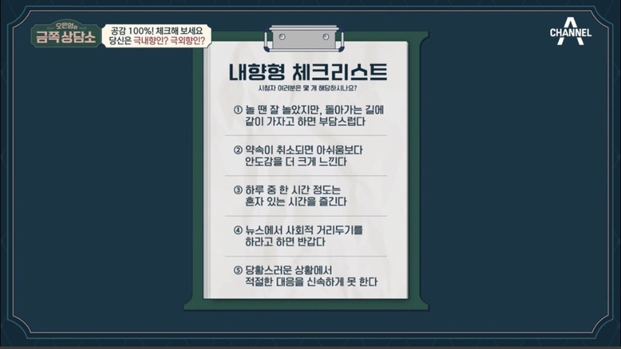 '금쪽상담소 김혜성 편'을 보다가 저거 딱 내 얘기 인데라는 생각이 들었다. 내향형 체크리스트를 해봤을 때 나는 5가지 모두에 해당되었다. 1번인 돌아가는 길에는 혼자 오늘 일을 정리하면서 가는 것이 좋고 2번처럼 약속을 잡고 나서 막상 당일에 나가기 싫어 핑계를 대고 취소한 경우도 없지 않다. 3번은 1시간은 물론 하루종일도 잘 지낸다. 4번 코로나 시기가 오고 나서 나는 전과 후의 달라진 점을 모를 만큼 평온한 삶을 지냈다. 실제로도 코로나에 걸린 적이 한 번도 없다. 5번의 경우는 특히 공감하는데 나 같은 J형 사람은 만일을 위한 상황도 대비하기 위해 늘 시뮬레이션을 해본다. 갑작스러운 상황에 대처하지 못해 허둥지둥한 것이 너무 싫기 때문이다.