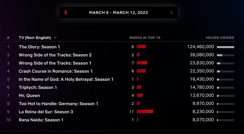 넷플릭스의 시리즈 <더 글로리> 파트 2가 글로벌 랭킹 1위에 오르면서 많은 이들의 관심을 받고 있습니다. 이 작품은 파트 1의 성공에 이어 파트 2가 공개되고 랭커가 되었으며, 시간당 조회 수 데이터를 보면 2위 작품과 3배 이상의 차이를 보여 초대박 흥행 작품으로 자리 잡았습니다.
