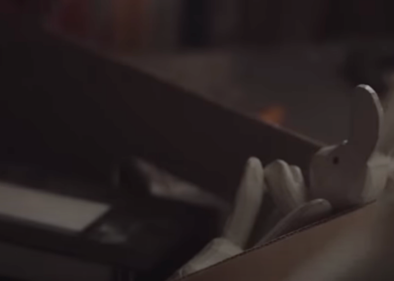 상자에서 꺼내는 먼지 묻은 비디오테이프. 비디오 플레이어에 테이프를 넣는 여자.