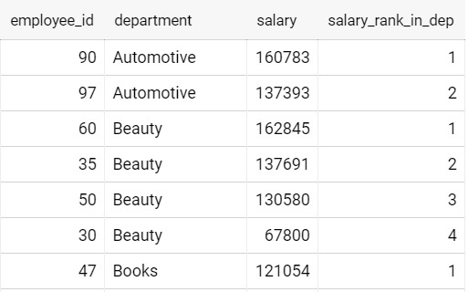 ROW_NUMBER() OVER(PARTITION BY department ORDER BY salary DESC) AS salary_rank_in_dep