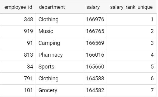 ROW_NUMBER() OVER(ORDER BY salary DESC) AS salary_rank_unique